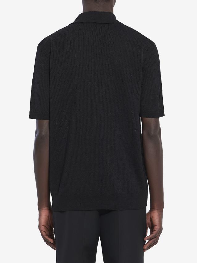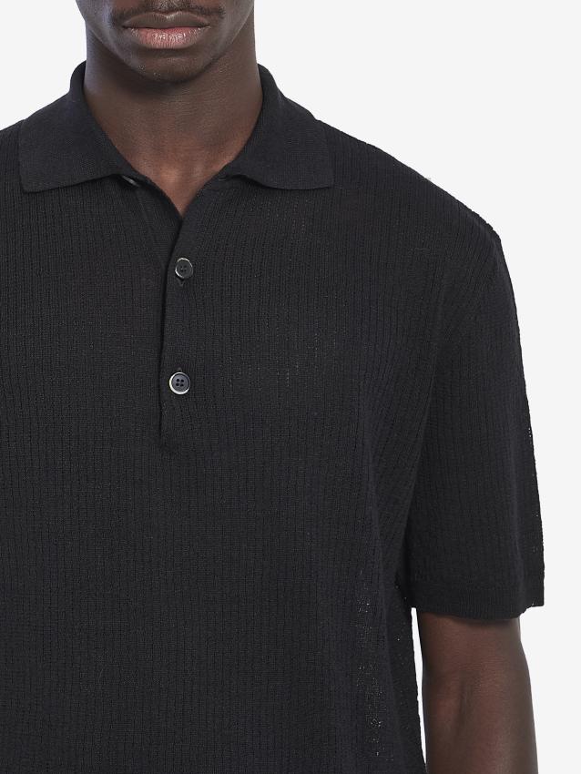 Marco Alafin short-sleeve polo shirt in lightweight, semi-sheer black linen and cotton knit. It features a classic collar, a buttoned placket, and