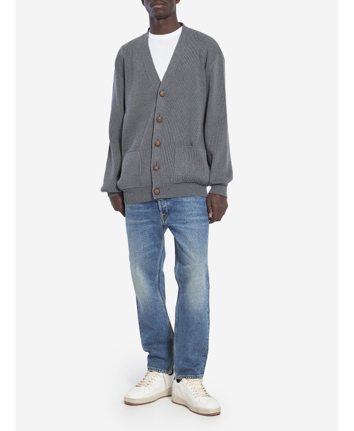 Gray melange cotton cardigan. It features a V-neck, front closure with brown leather buttons, two applied front pockets, an inverted Golden logo in