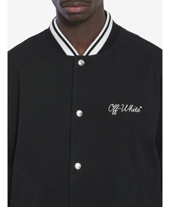 Varsity Souvenir jacket in black cotton. It features a ribbed collar with white stripes, a front snap-button closure, a white embroidered Off-White