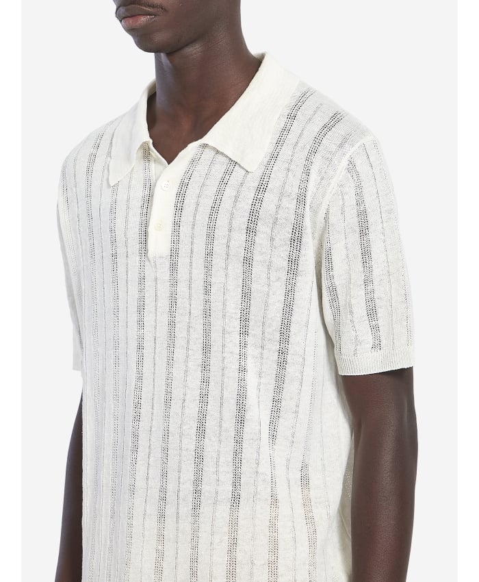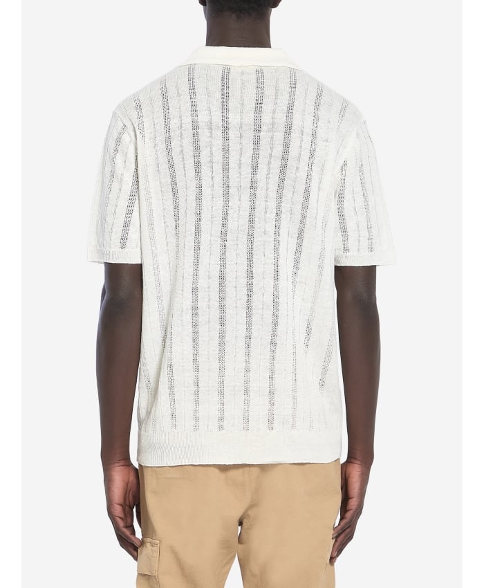 Lightweight white linen short-sleeve polo shirt with openwork knit detailing. It features a classic collar, a three-button placket, and ribbed collar