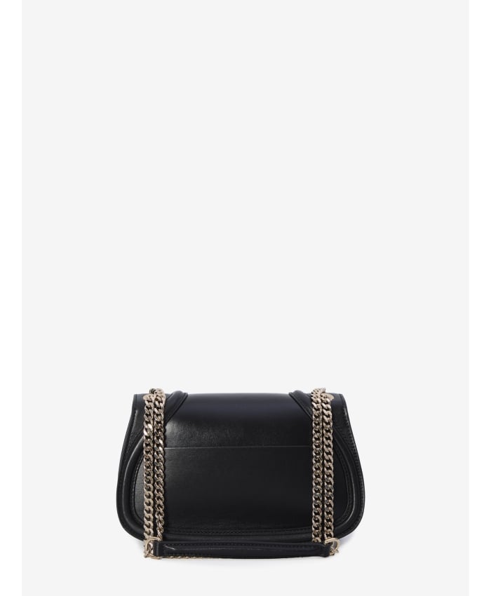 Small Gucci Blondie bag in black leather. It features a black enameled Round GG Interlocking detail on the flap, a sliding chain strap, a flap with
