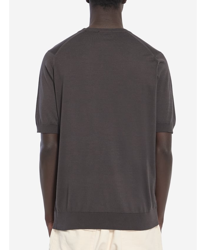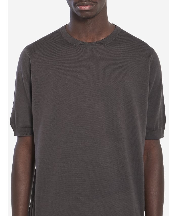 Short-sleeved crewneck Kempton t-shirt in soft brown Sea Island cotton. Ribbed collar, cuffs and hem. Regular fit. The model is 186cm tall and wears