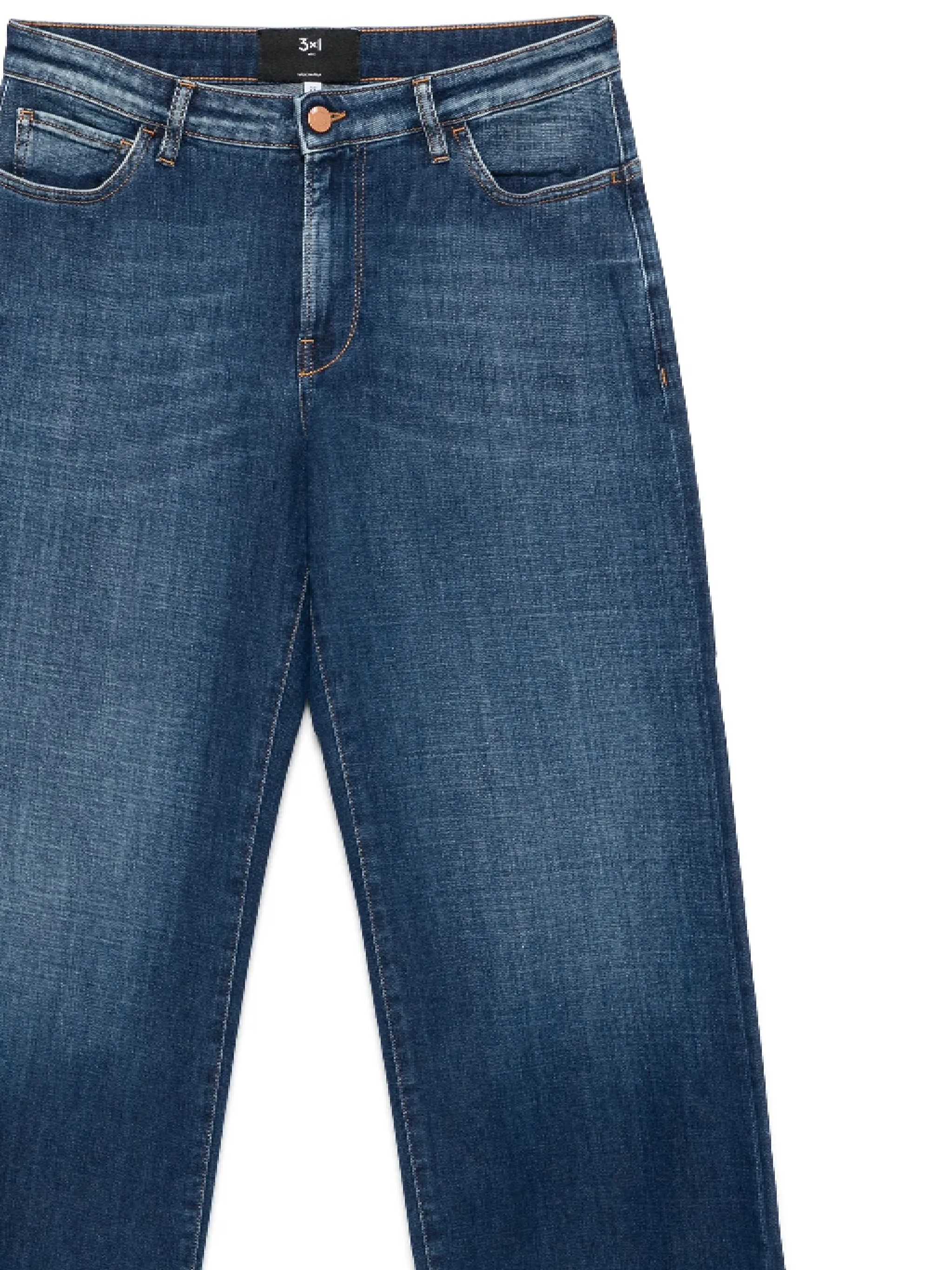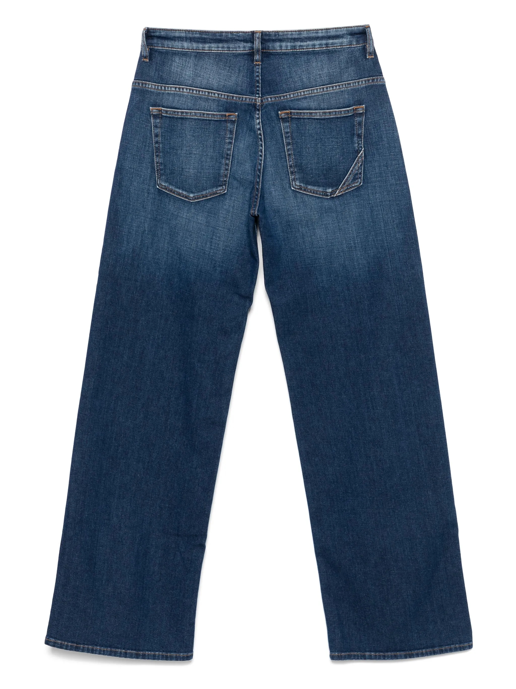indigo blue concealed fly and button fastening belt loops classic five pockets whiskering effect at the thighs