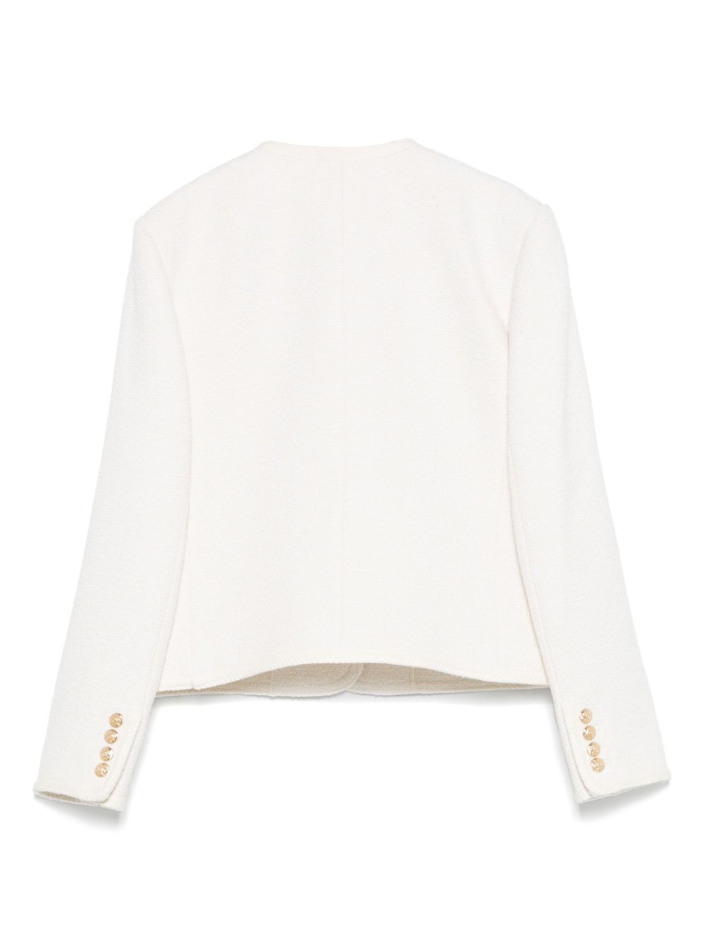 white front button fastening two front patch pockets long sleeves buttoned cuffs