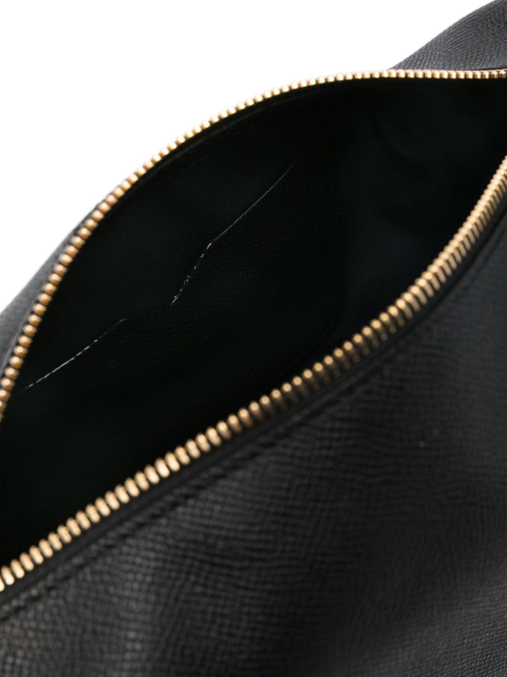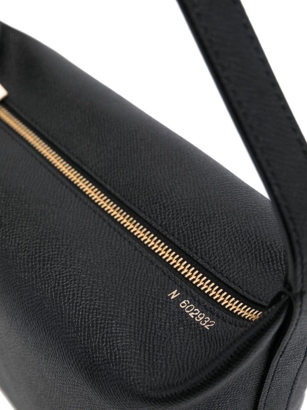 Black, calfskin, smooth grain, adjustable shoulder strap, top zip closure, internal bellows pocket, full lining and gold-tone details.