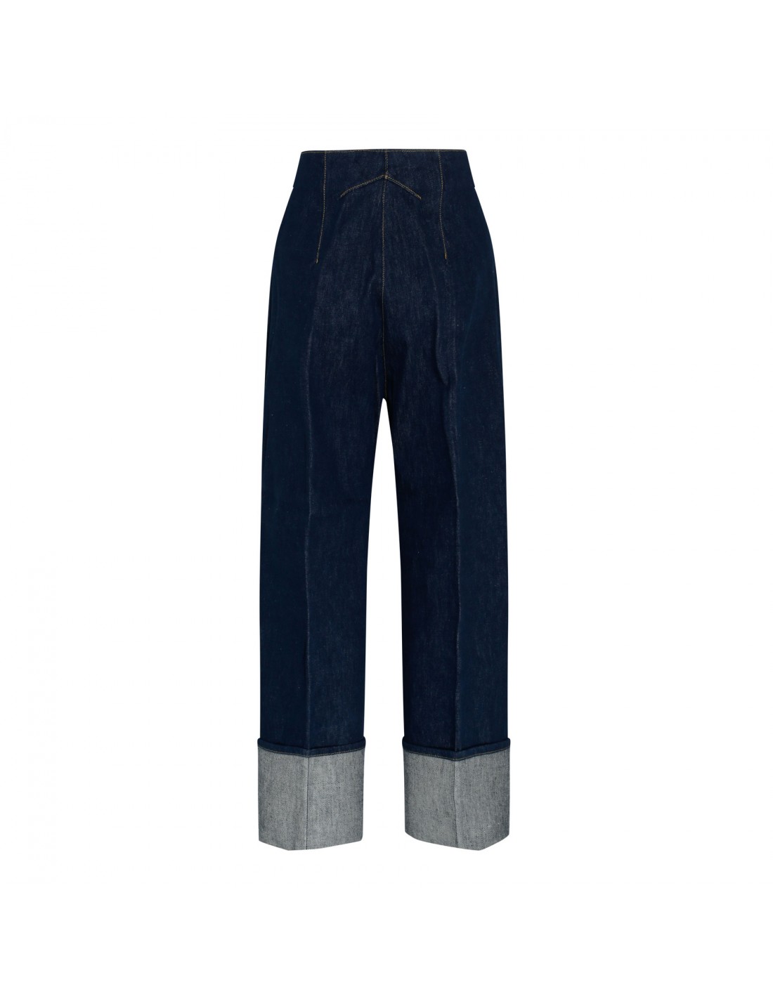 Rodeo blue organic denim iconic jeans from Patou featuring straight-leg, contrast stitching, engraved gold-coloured button and zip fastening on front, belt loops at the waistband, side pockets, darts at the back, turned up cuffs.