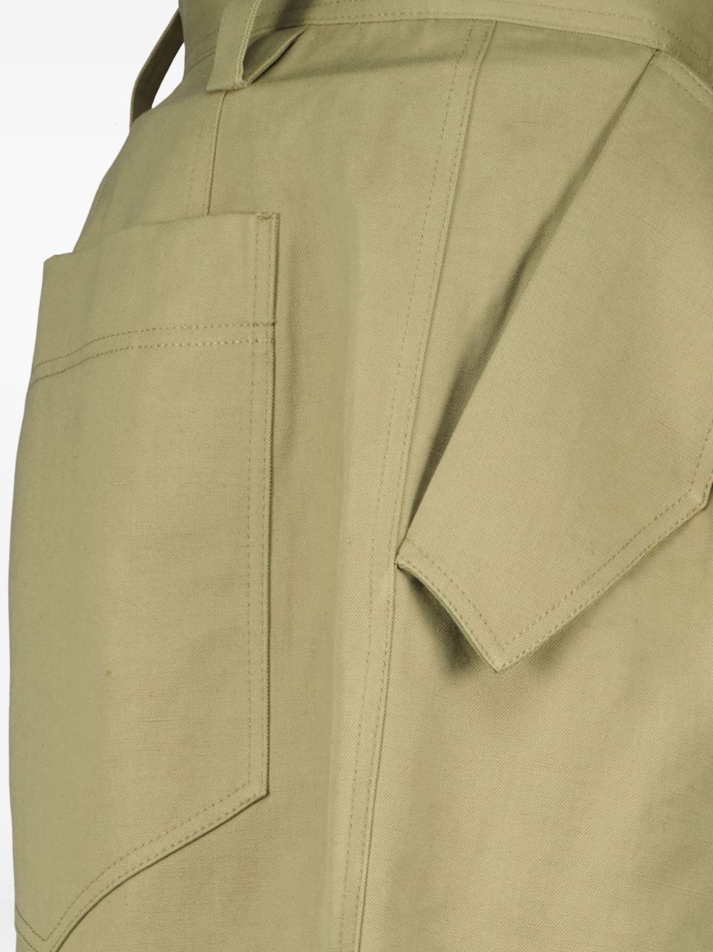 khaki concealed front button, hook and zip fastening belt loops two side slit pockets two rear patch pockets