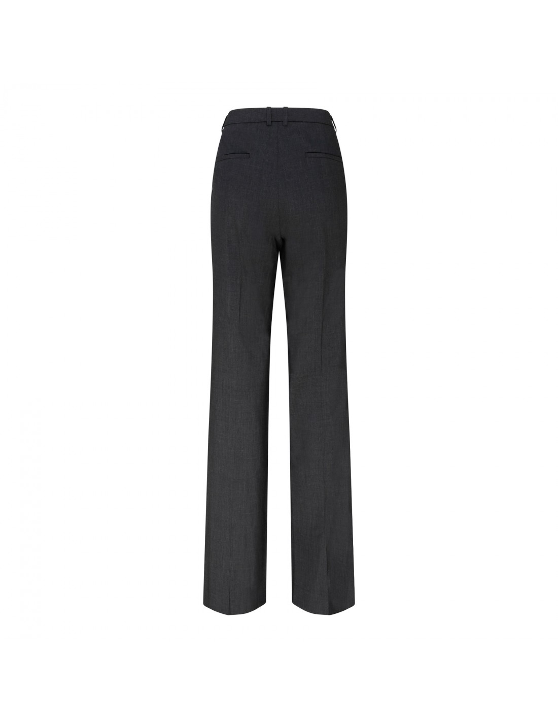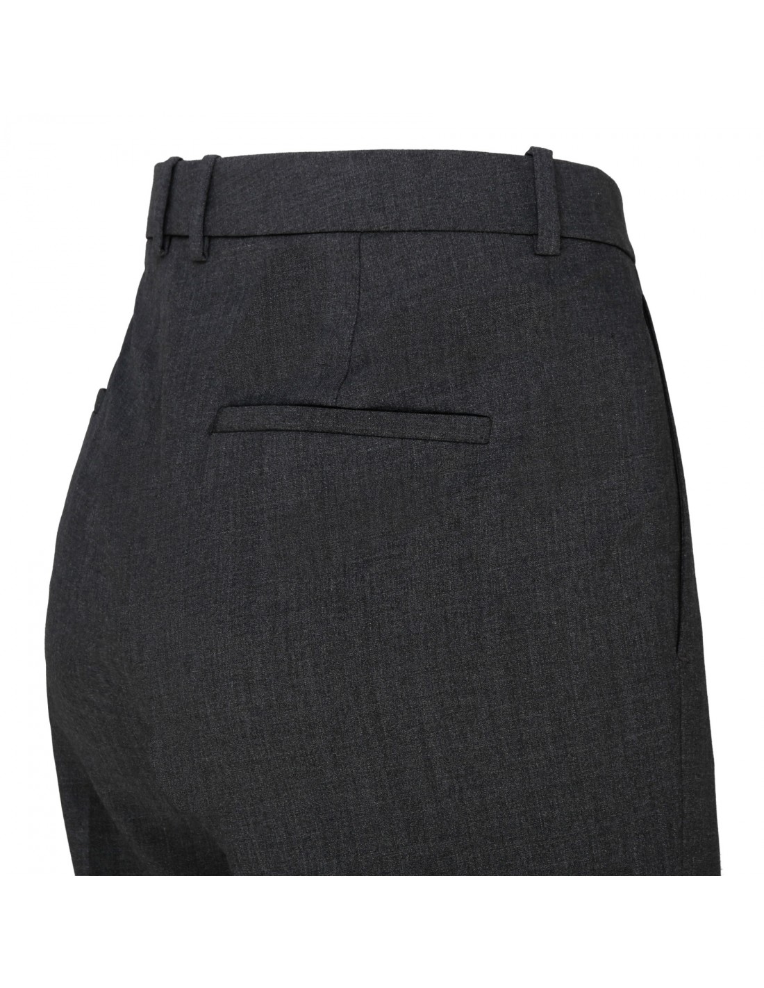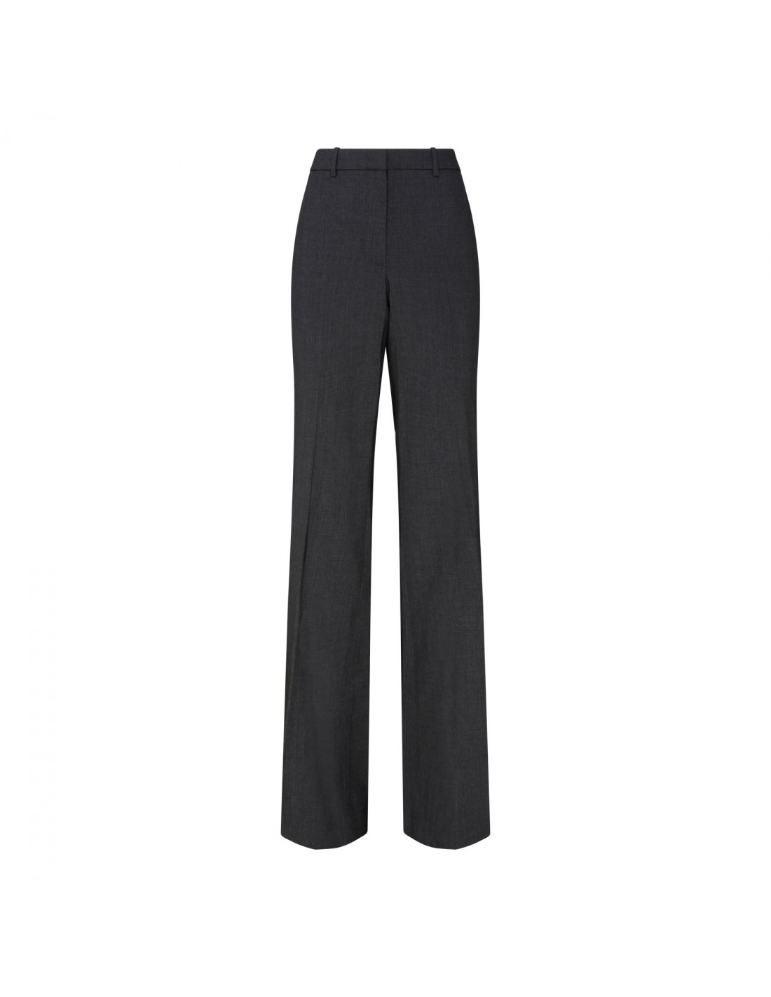 Charcoal melange wool pants from Theory featuring mid-rise, narrow waistband, pressed creases, belt loops on the waistband, hook-and-zipper fastening, side slip pockets, back welt pockets, flare leg, full length.