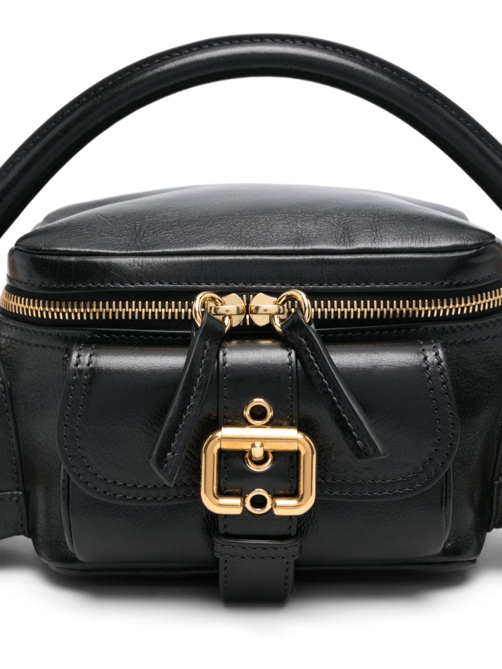 black leather pebbled texture high-shine finish all-around zip fastening single detachable top handle adjustable shoulder strap front flap pocket two side zip-fastening pockets main compartment internal patch pocket internal logo patch linen lining This piece comes complete with a protective dust bag.