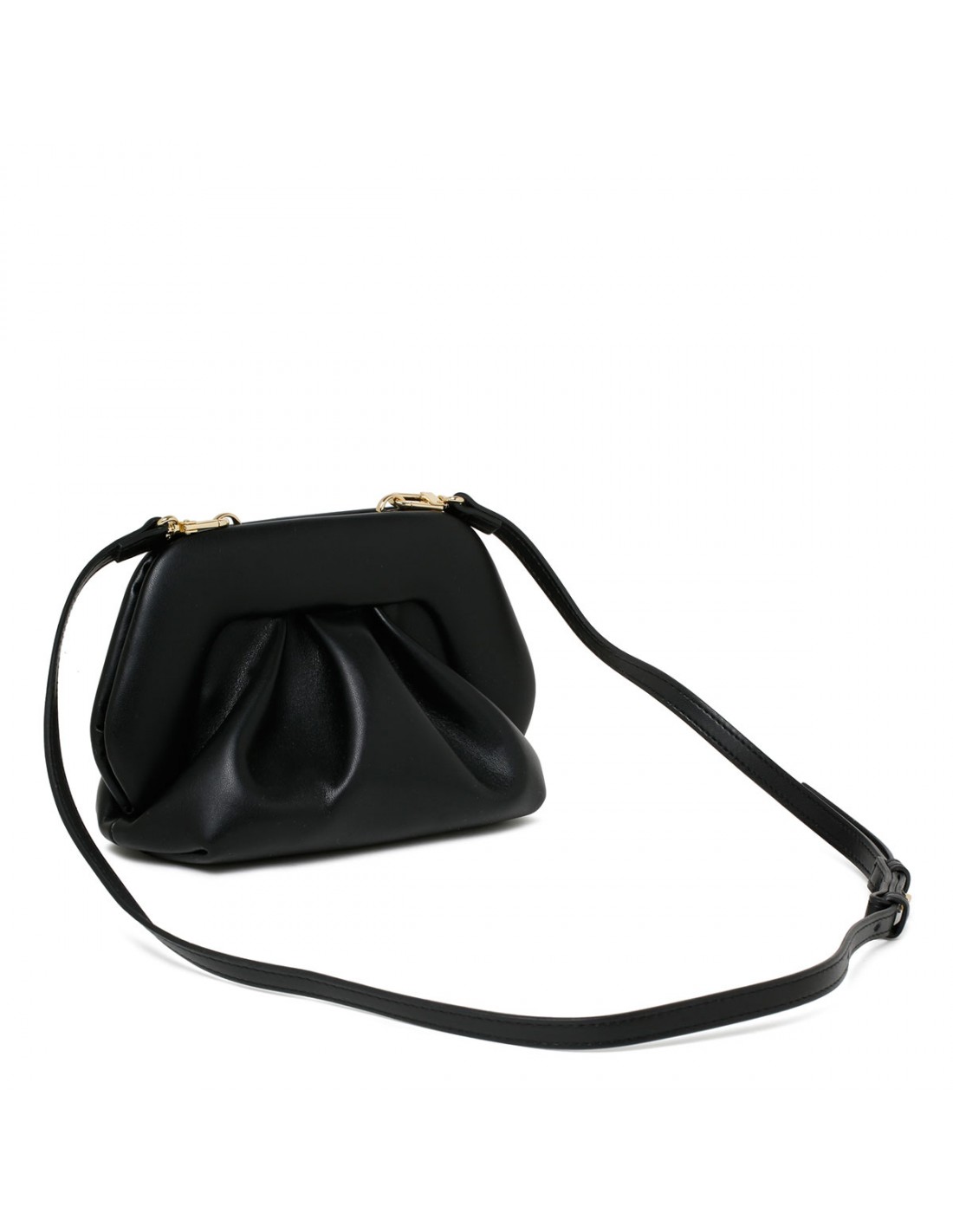 Black vegan fabric Gea clutch bag from Themoire featuring tonal detachable shoulder strap and magnetic fastening.