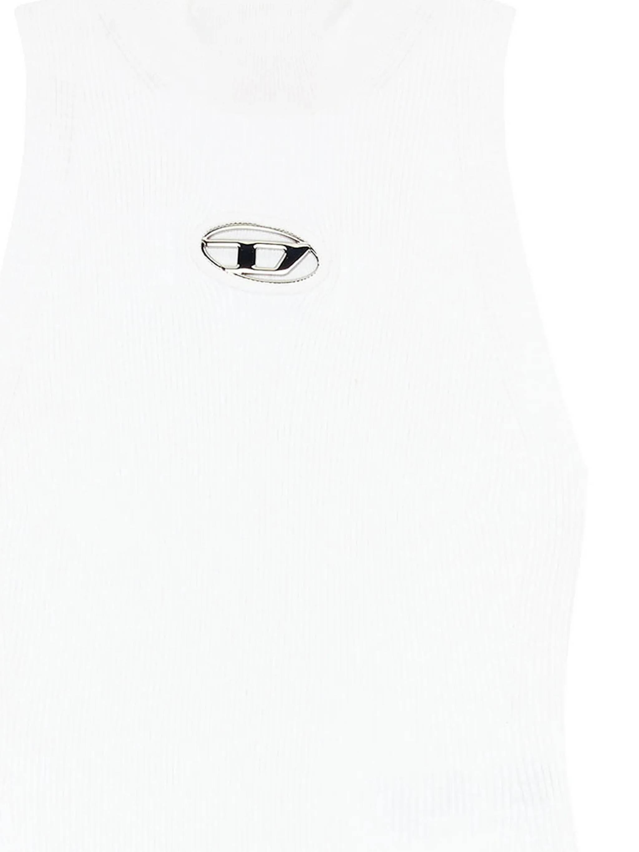 optical white ribbed knit silvertone logo plaque high neck sleeveless straight hem