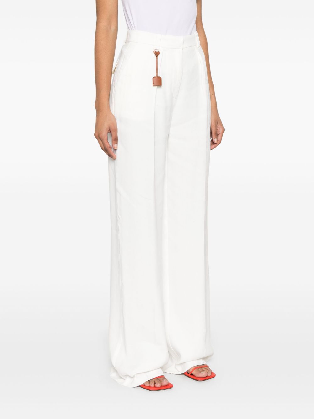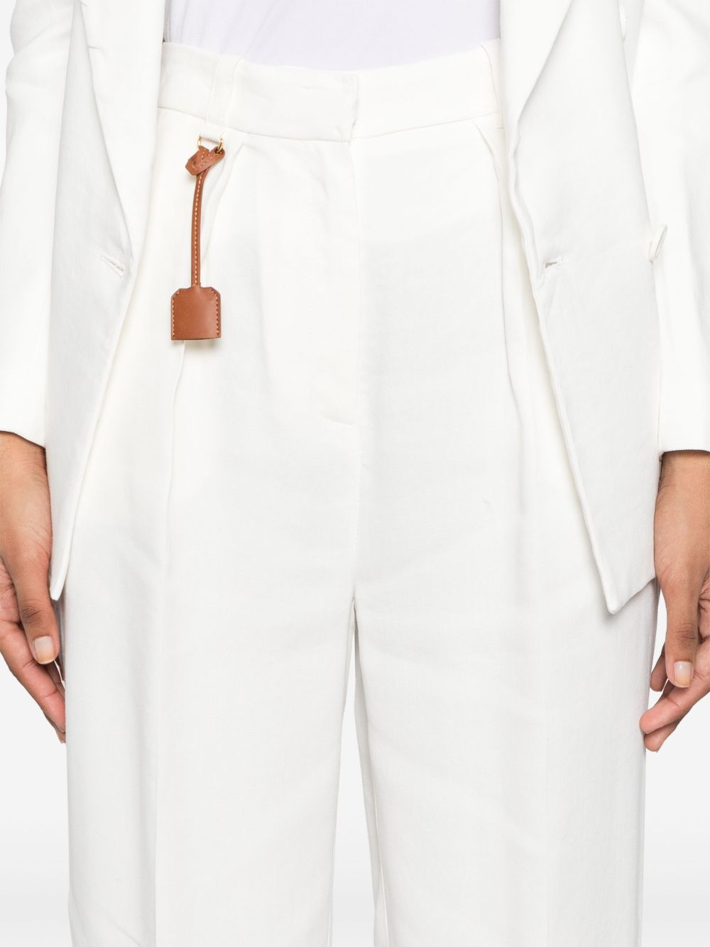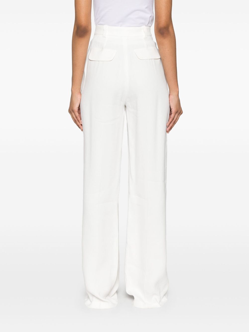 white concealed front button, hook and zip fastening belt loops two diagonal pockets to the sides faux pocket detail