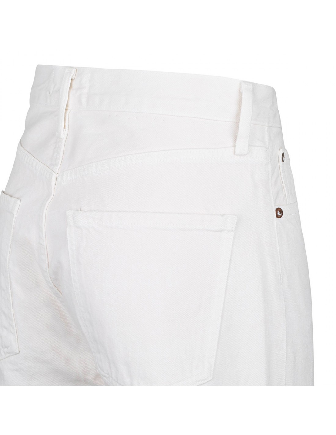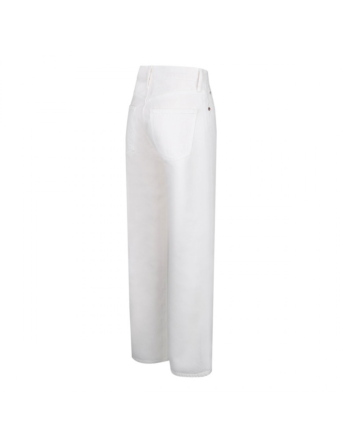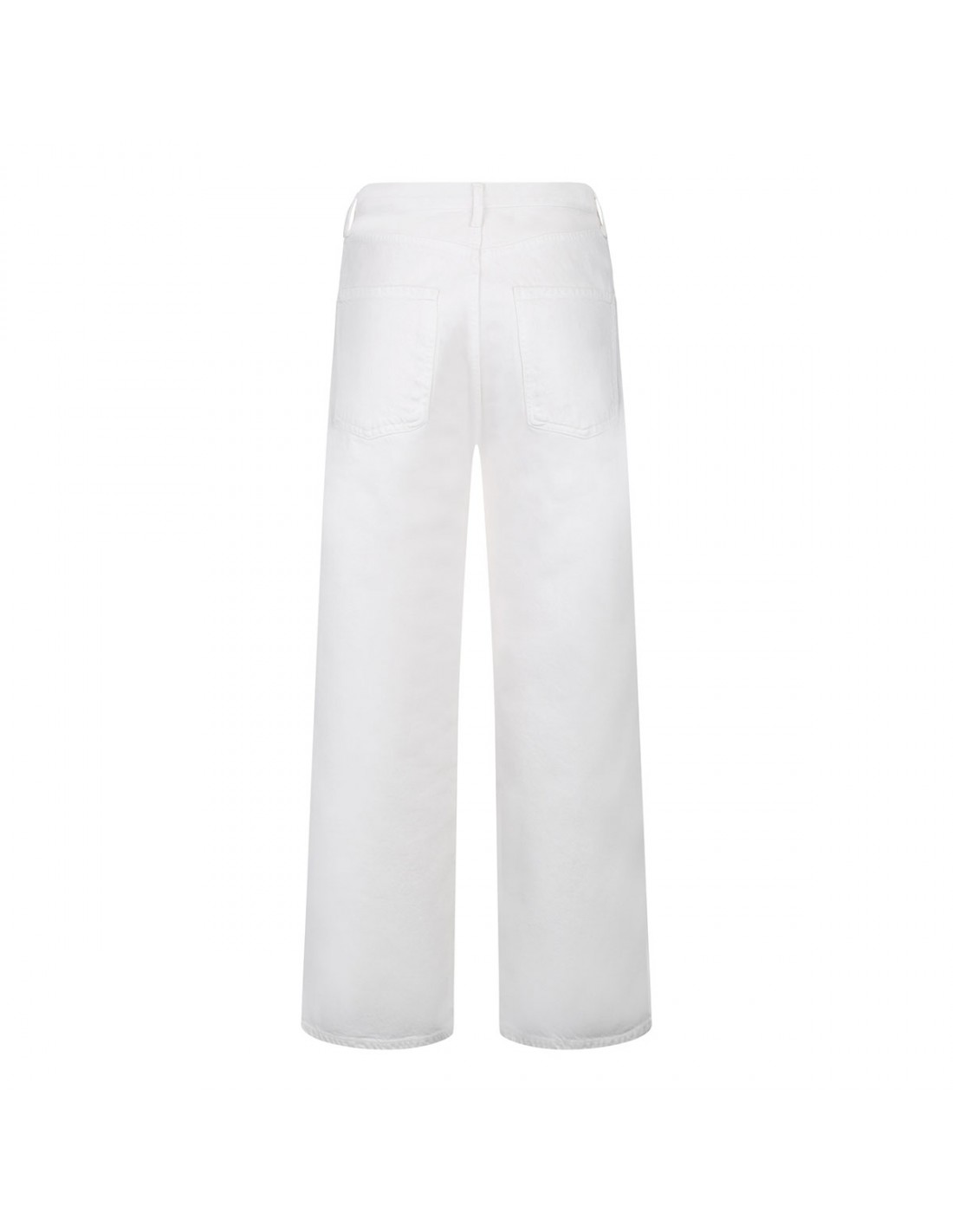 Eggshell warm white rigid organic cotton denim Ren jeans from Agolde featuring high-rise waist, relaxed fit, wide leg, classic five-pocket style, button closure, zip fly.