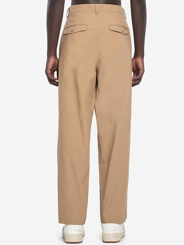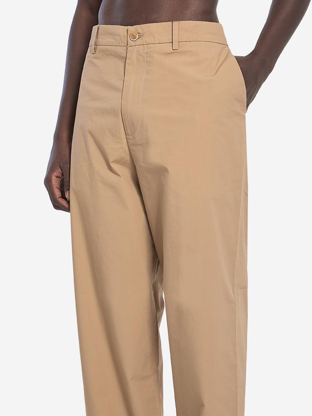 Canasta Vion mid-rise trousers in khaki stretch cotton poplin. They feature a button and zip closure, belt loops, two side pockets, two back flap