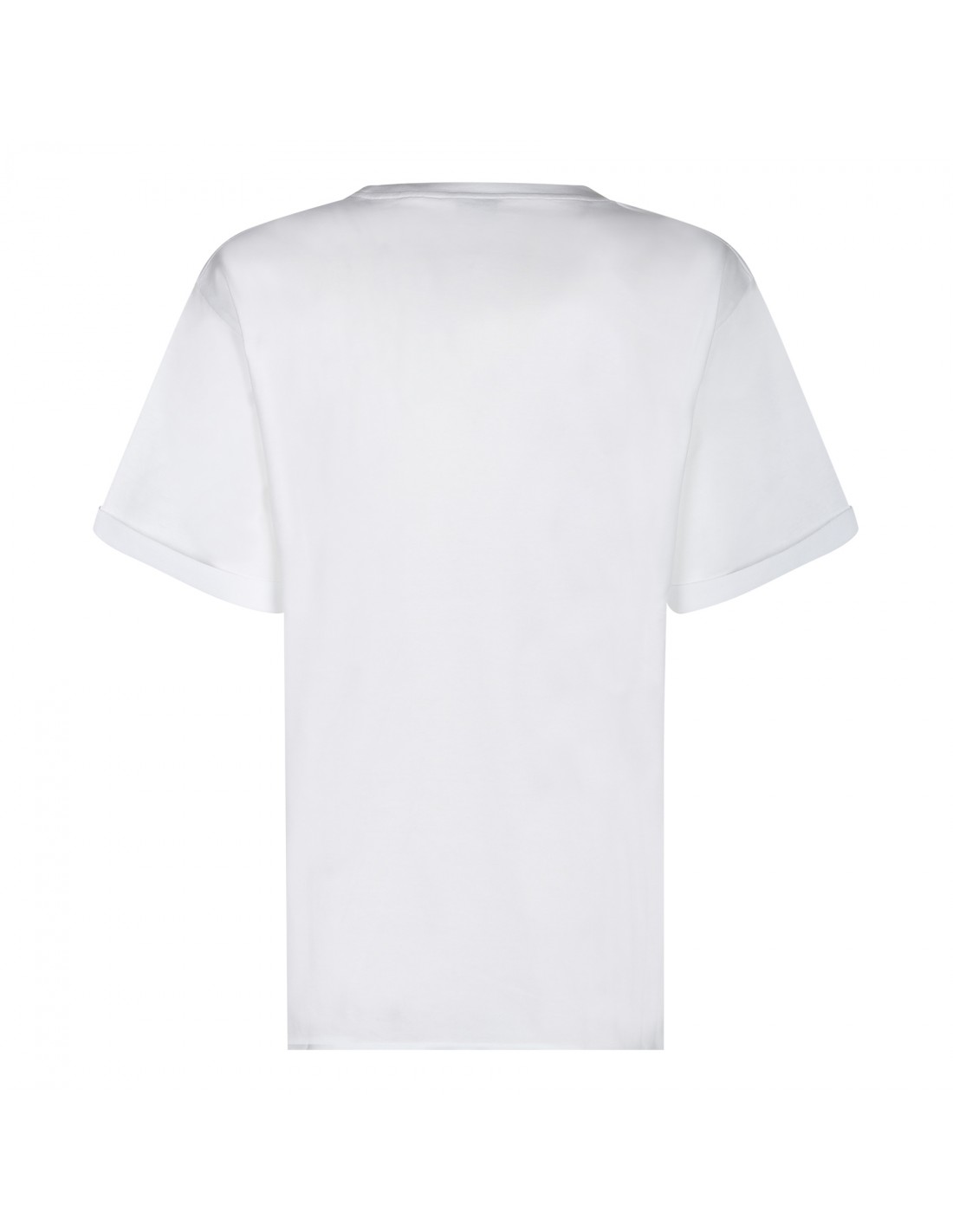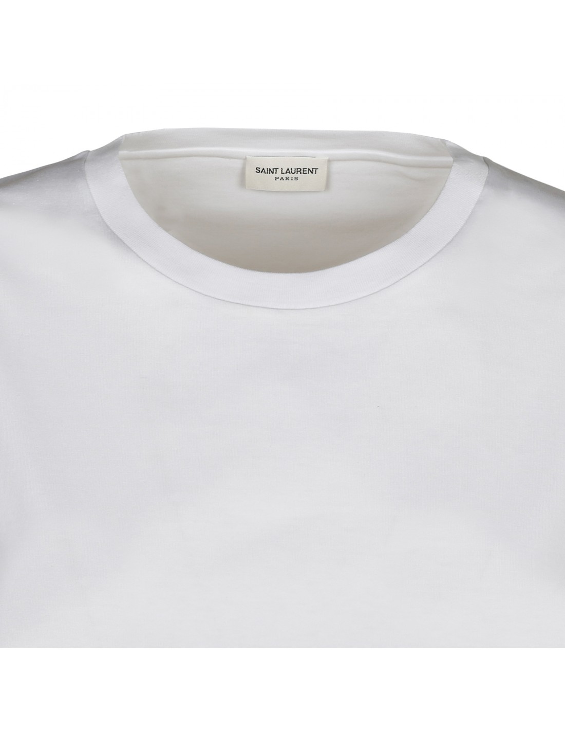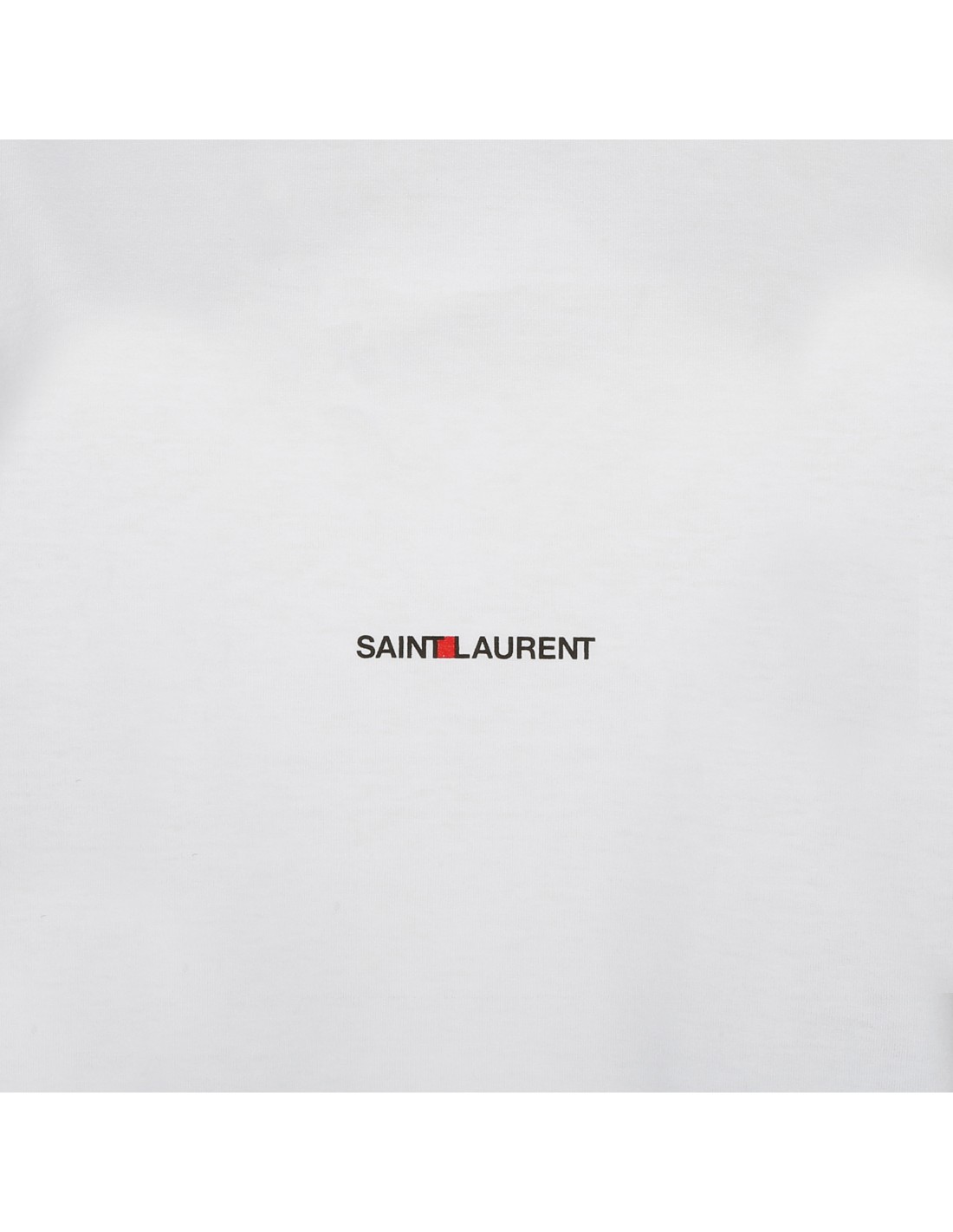 White organic cotton Rive Gauche T-shirt from Saint Laurent featuring black logo printed on the chest, ribbed crew collar, classic fit and raw edge hem at back.