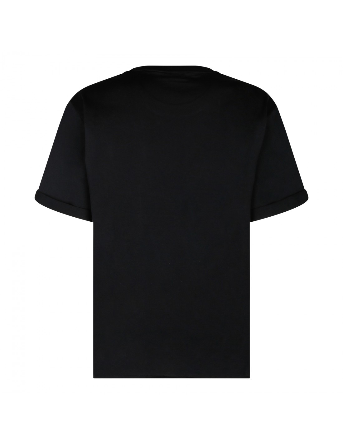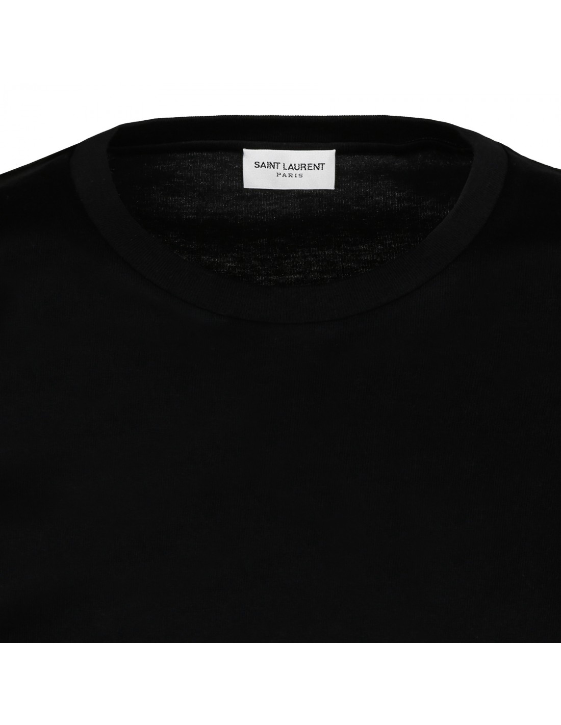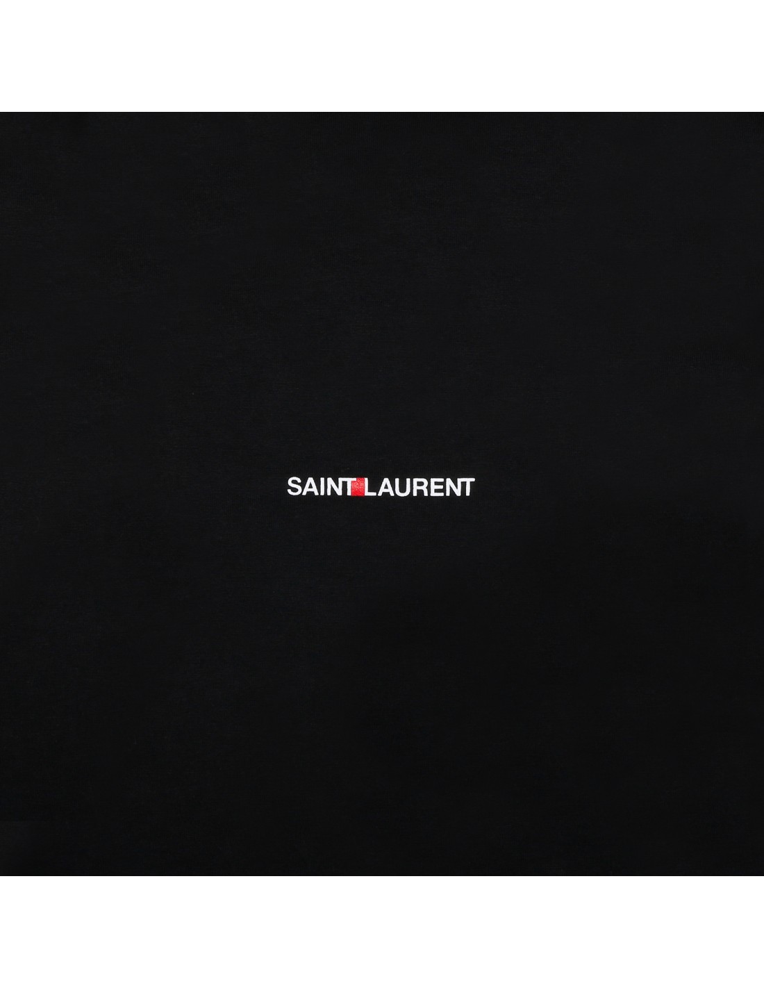 Black organic cotton Rive Gauche T-shirt from Saint Laurent featuring white logo printed on the chest, ribbed crew collar, classic fit and raw edge hem at back.