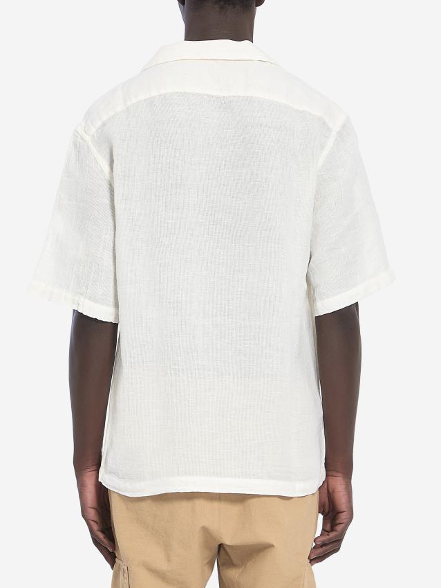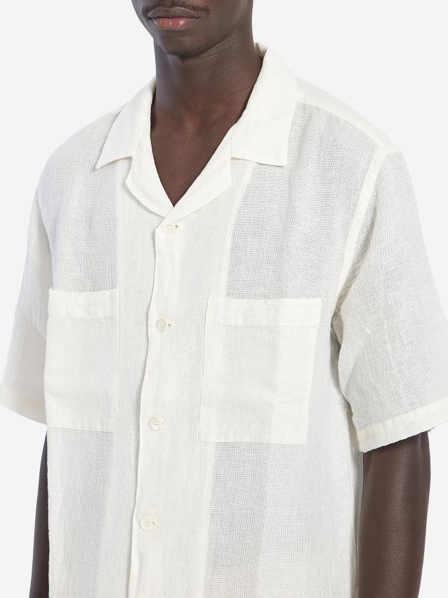 Solana Net short-sleeve shirt in a lightweight ivory linen and cotton blend. It features a pointed collar with revers, a front button closure, and