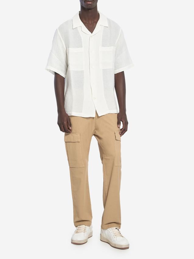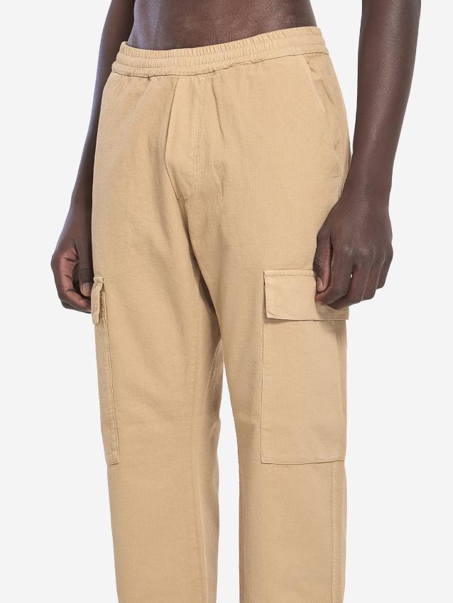 Tagio Arela trousers in khaki cotton crepe with a diagonal weave. They feature an elasticated waistband with a drawstring, a faux fly, two side