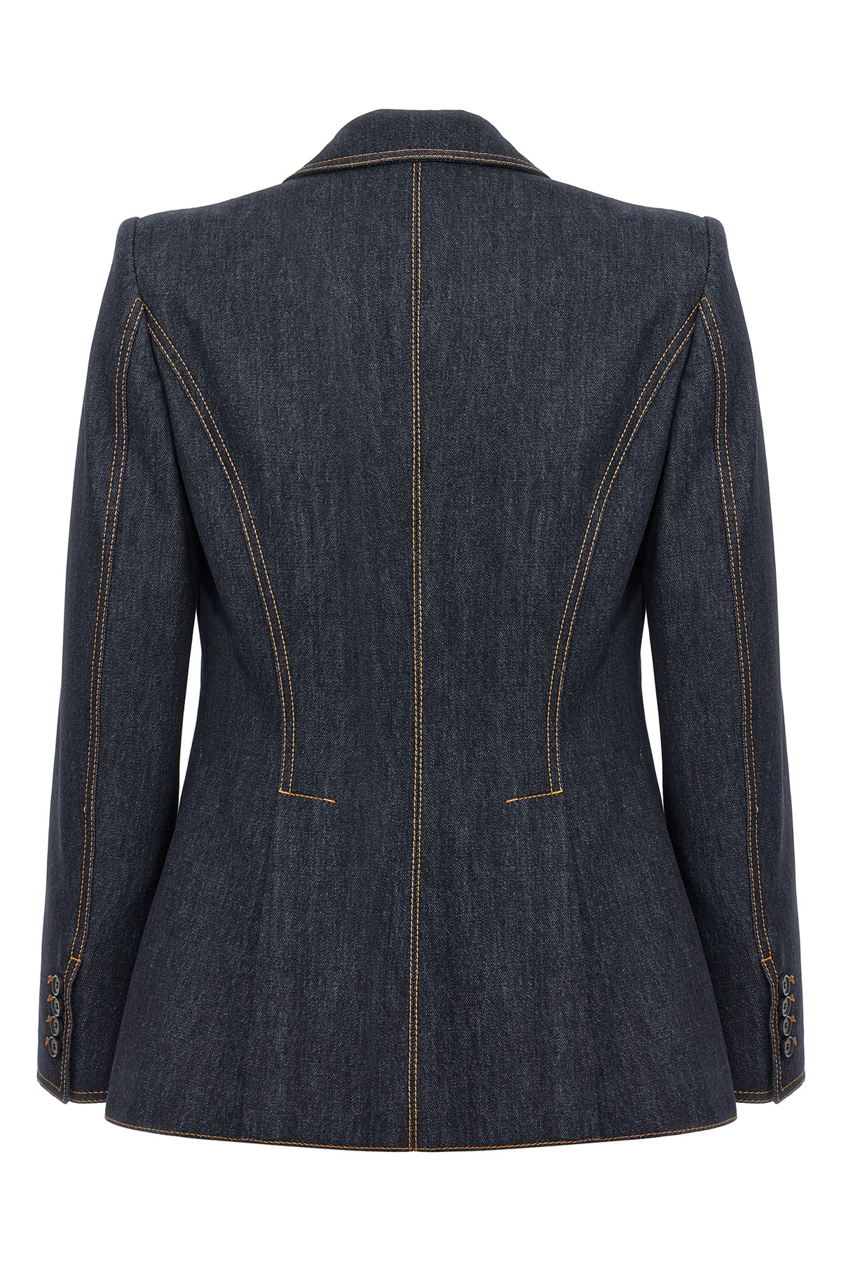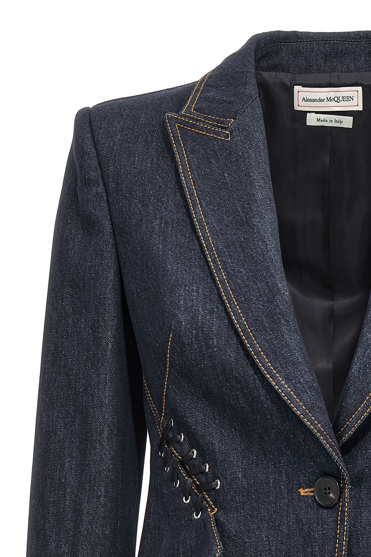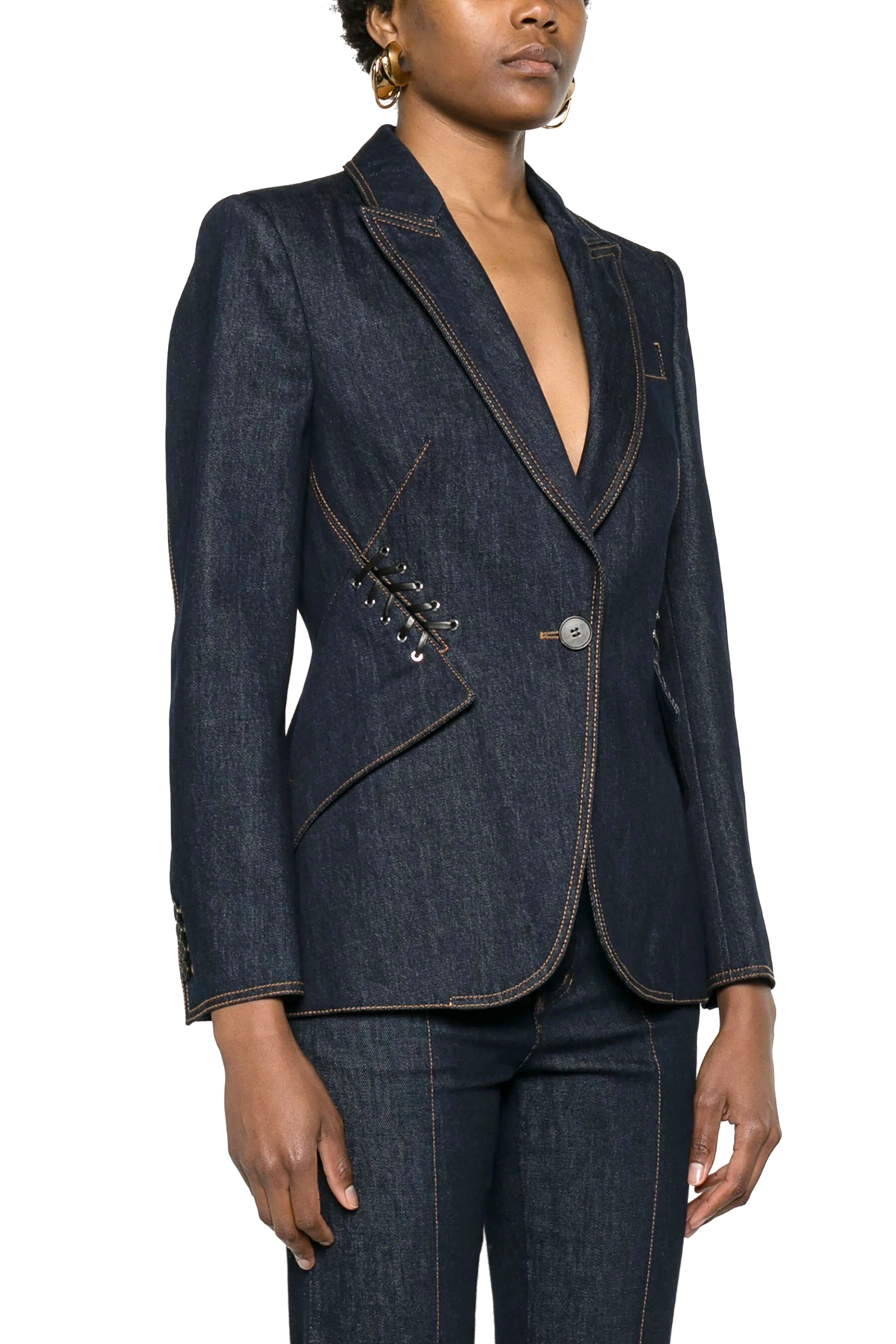 Single-breasted denim blazer with leather lace detail, button closure, long sleeves, back vents.