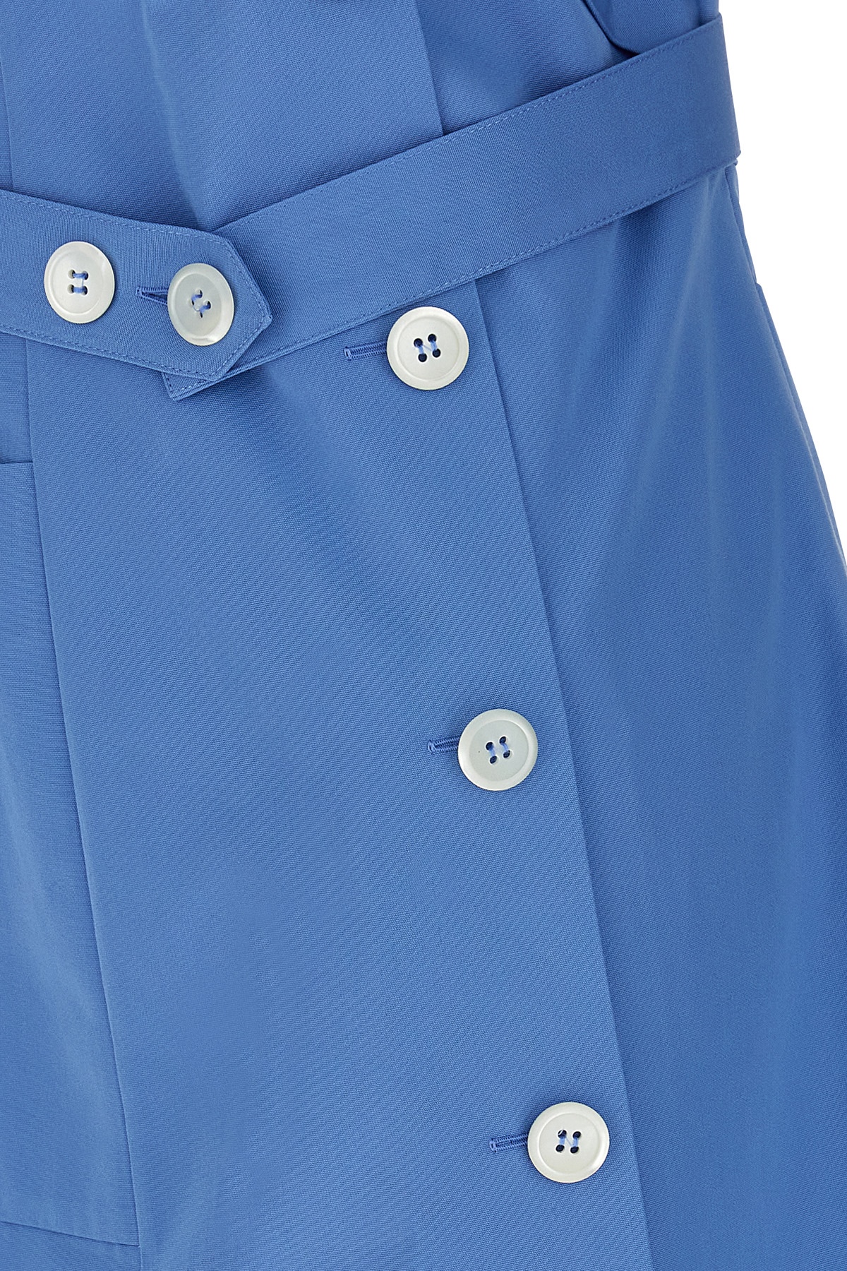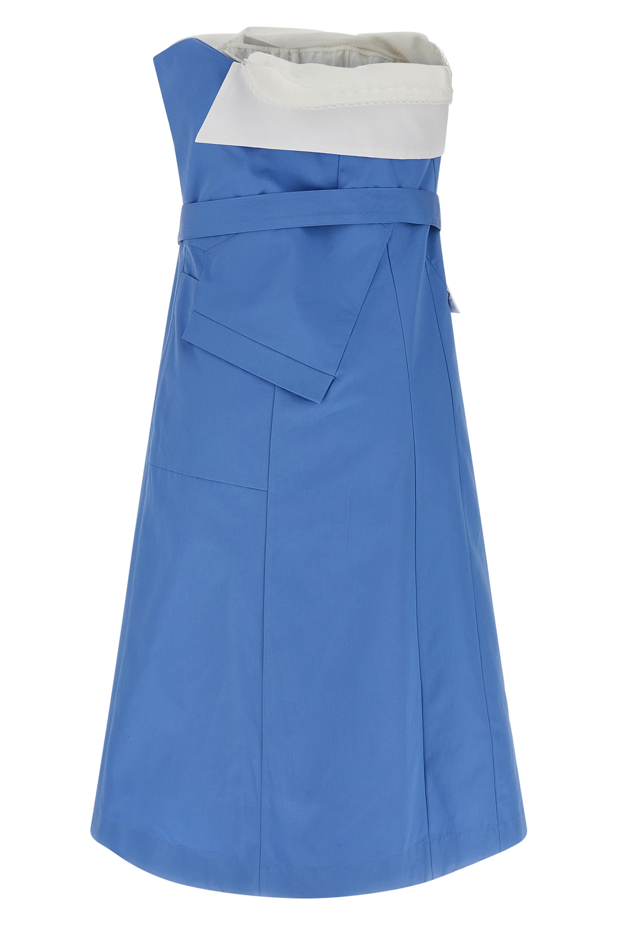 Off-the-shoulder mini dress in cotton poplin with unstructured shirt and inner bra top with hook closure, front trompe l'oeil button closure, side zip closure, pockets, belt.