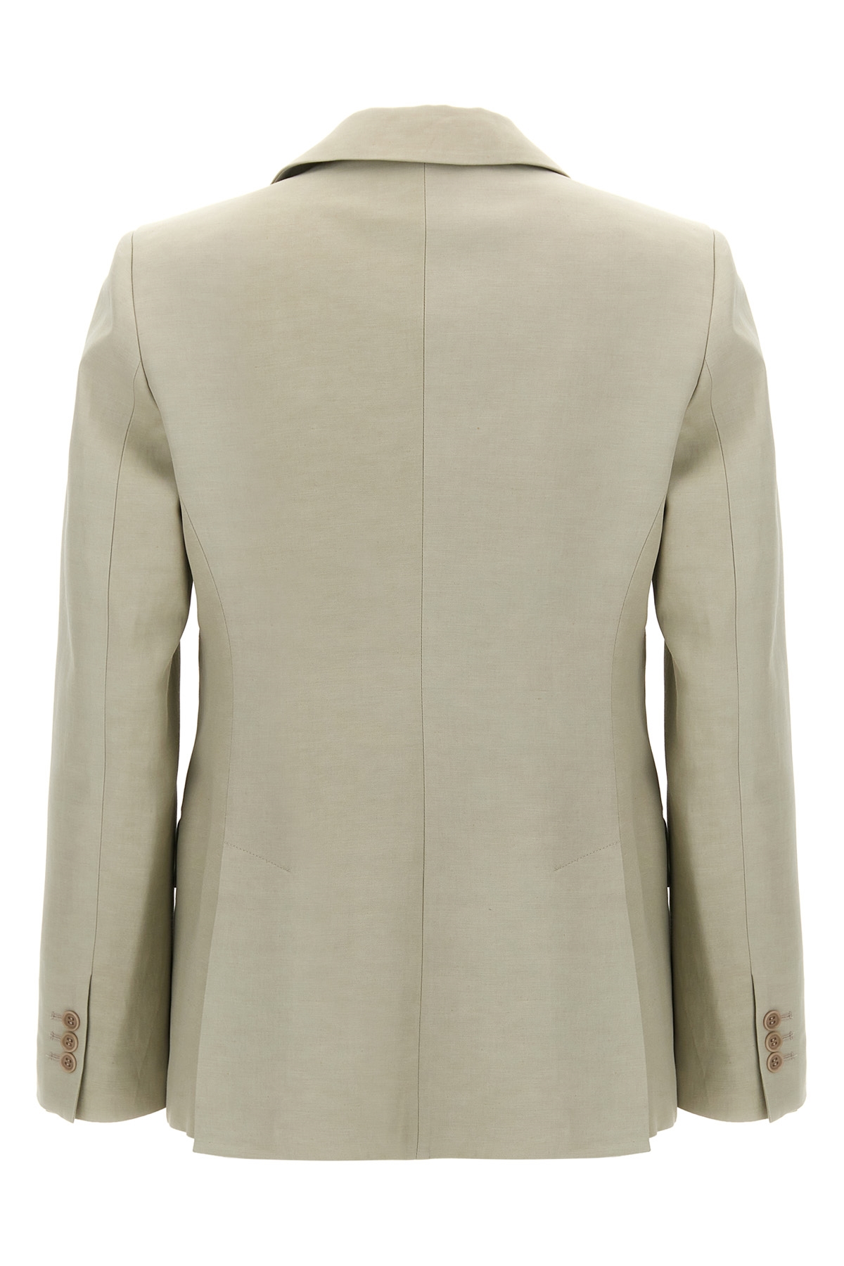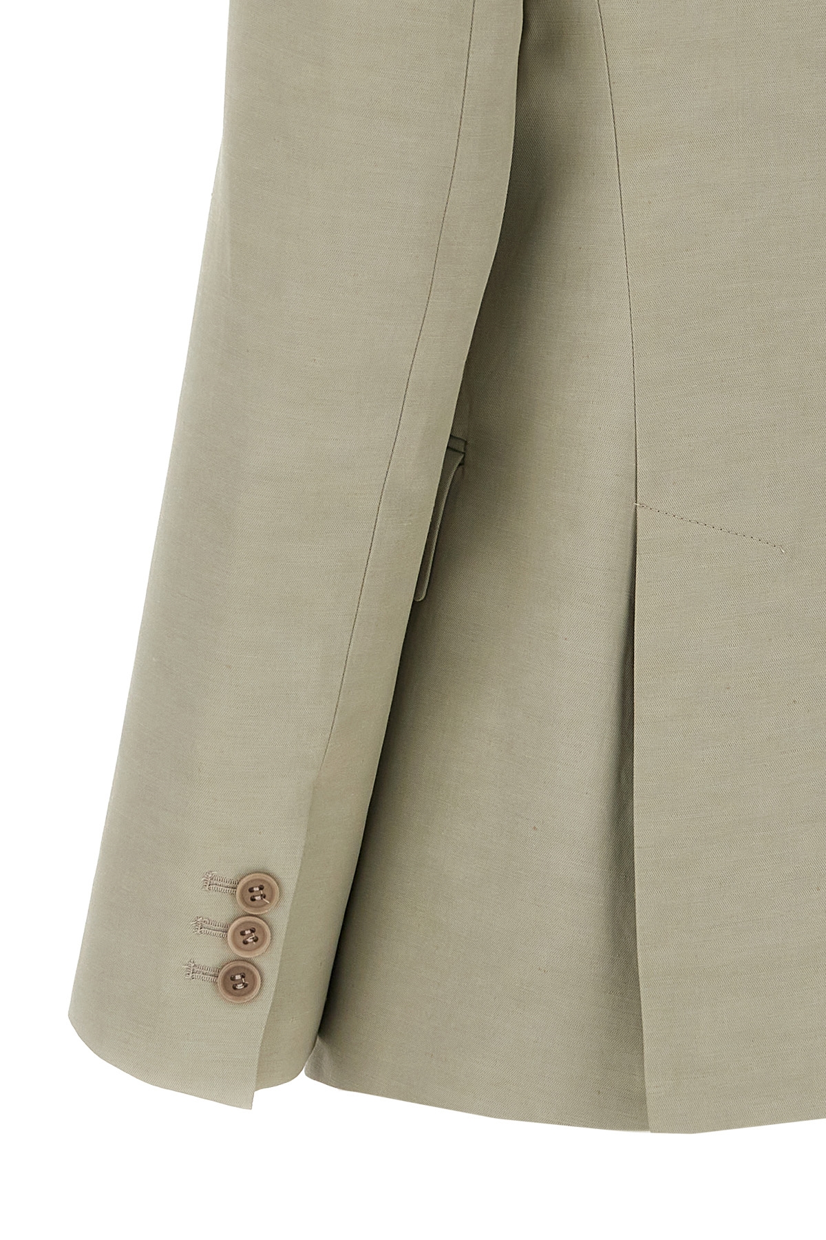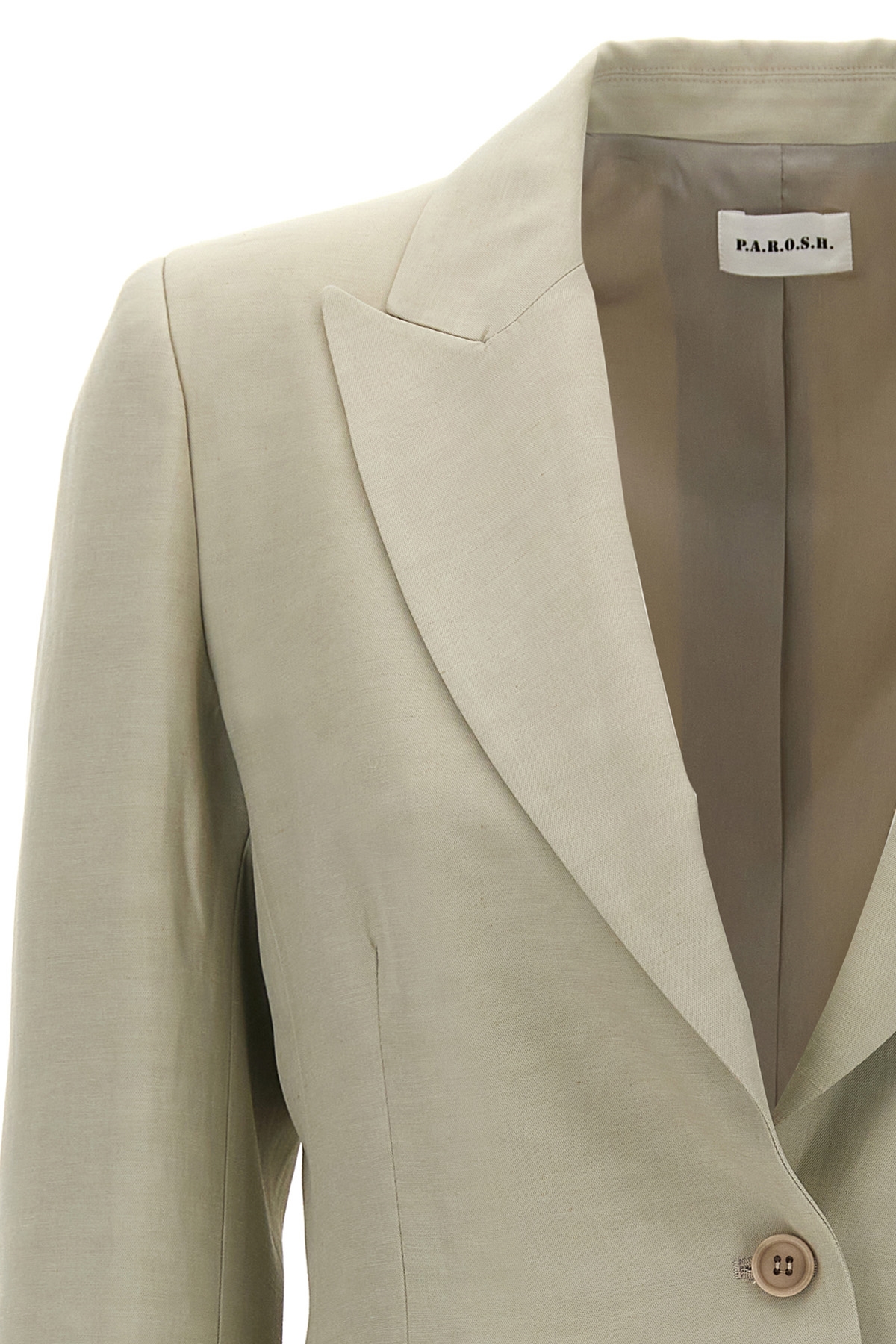 Single-breasted viscose linen blend blazer with single-button closure, pockets, long sleeves, side slits.