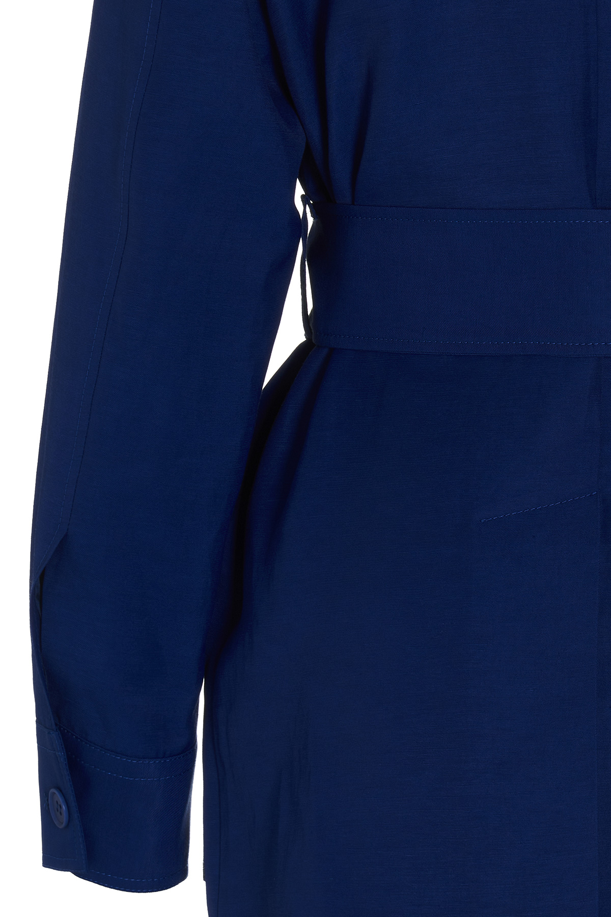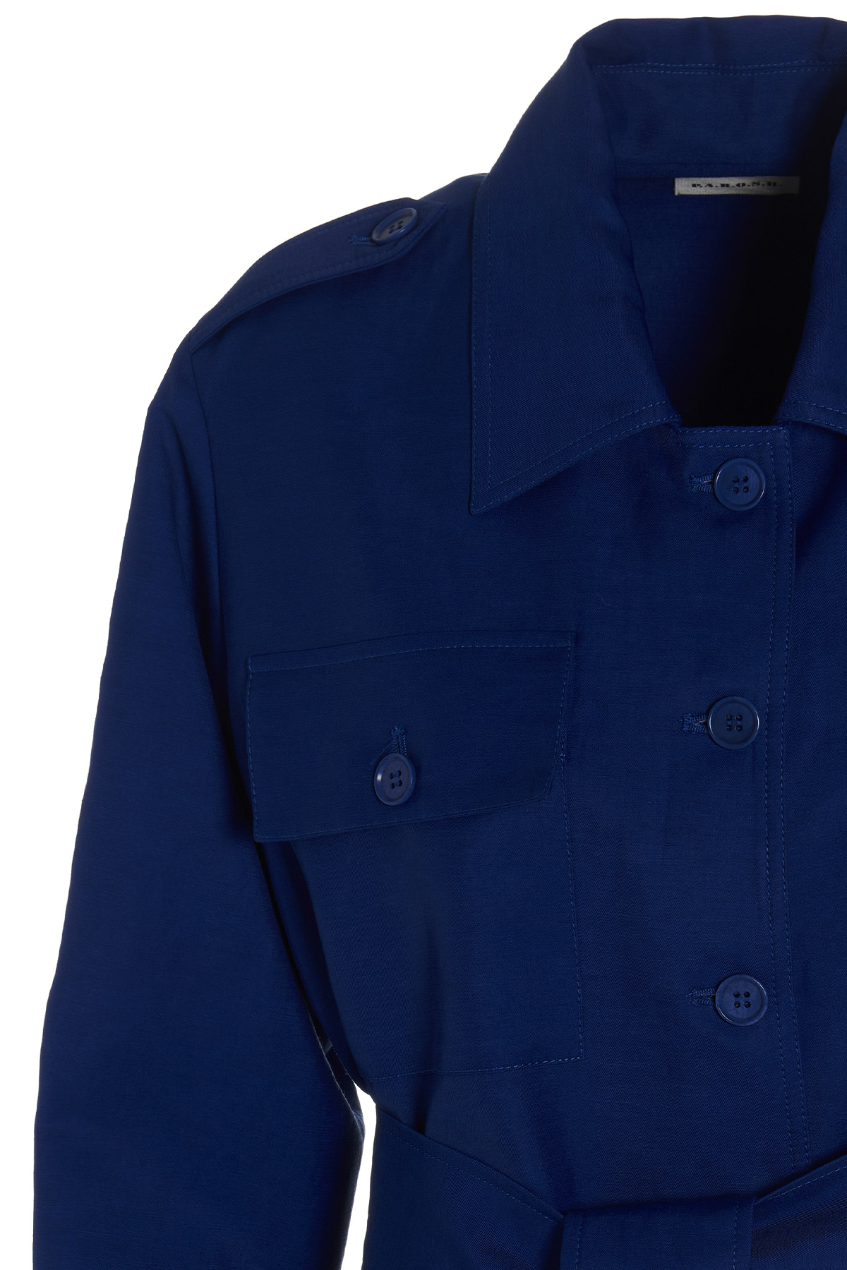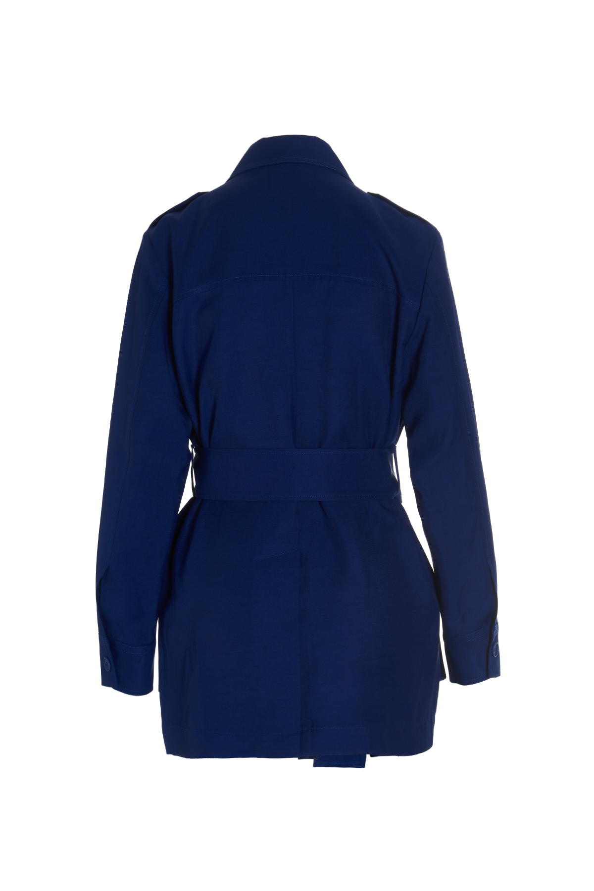 Viscose and linen blend bush jacket with button closure, a belt at the waist, pockets, and long cuffed sleeves.
