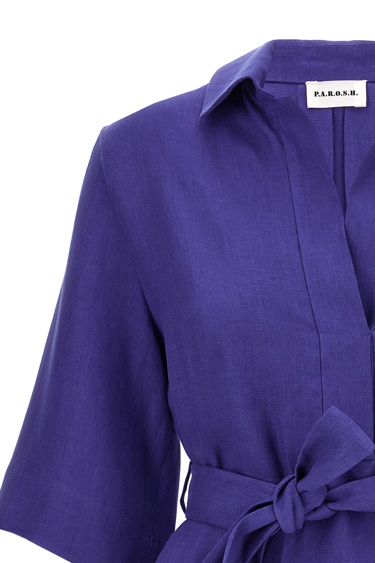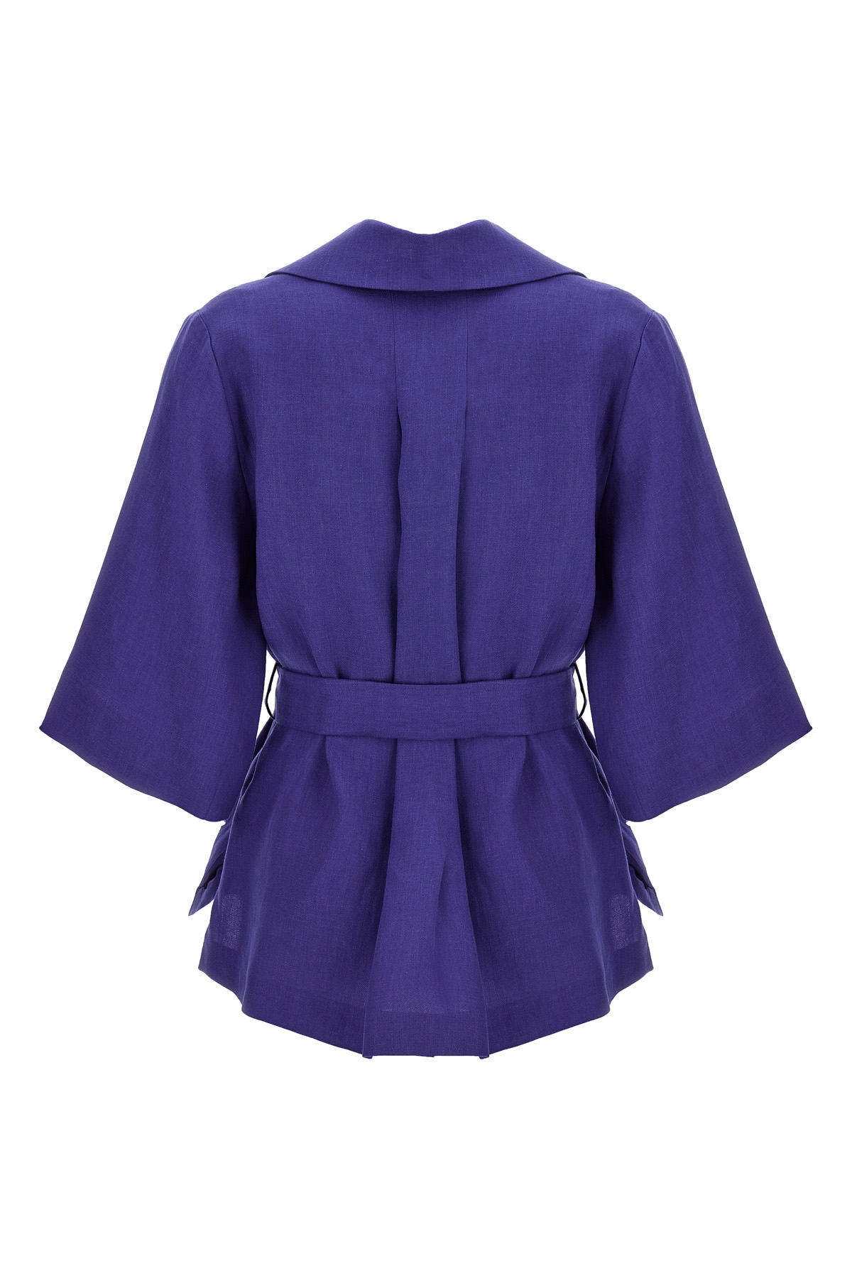 'Blitz' linen blouse with V-neck and collar, belt at the waist, short sleeves.