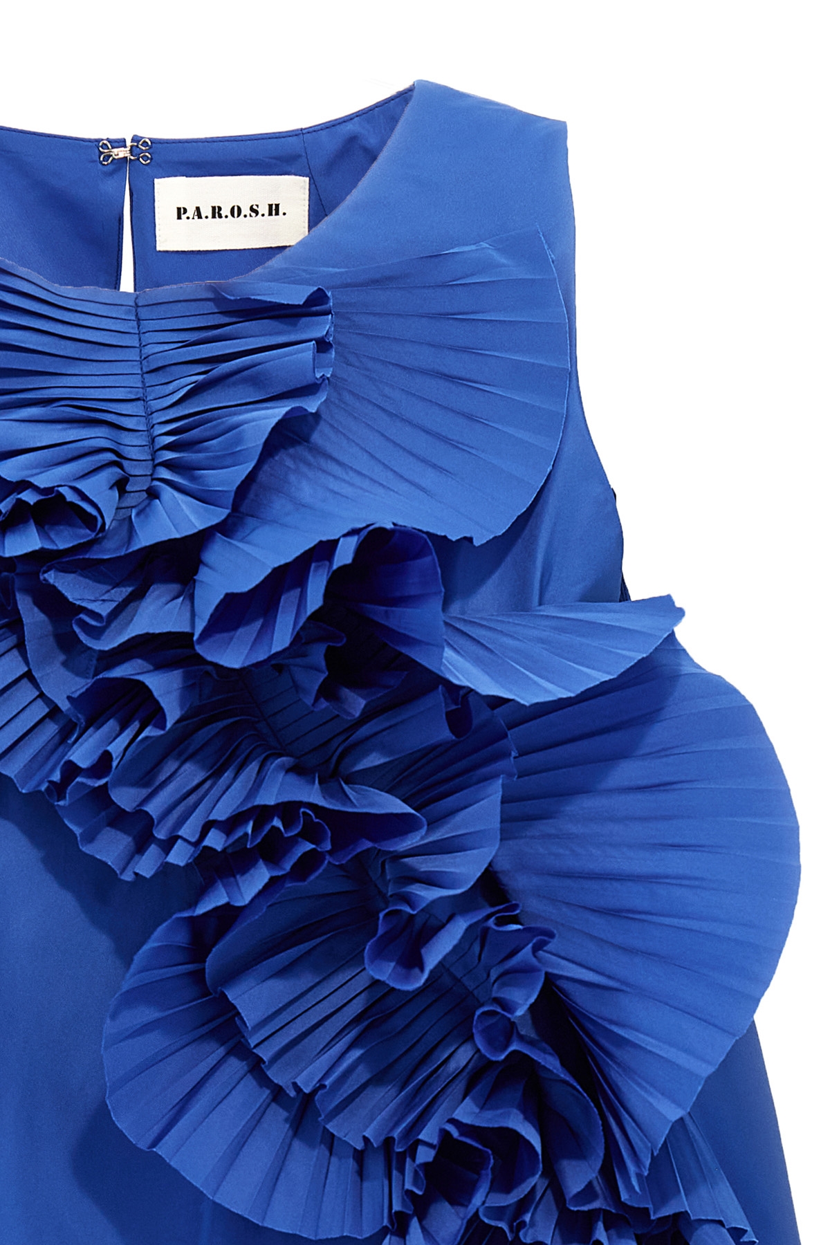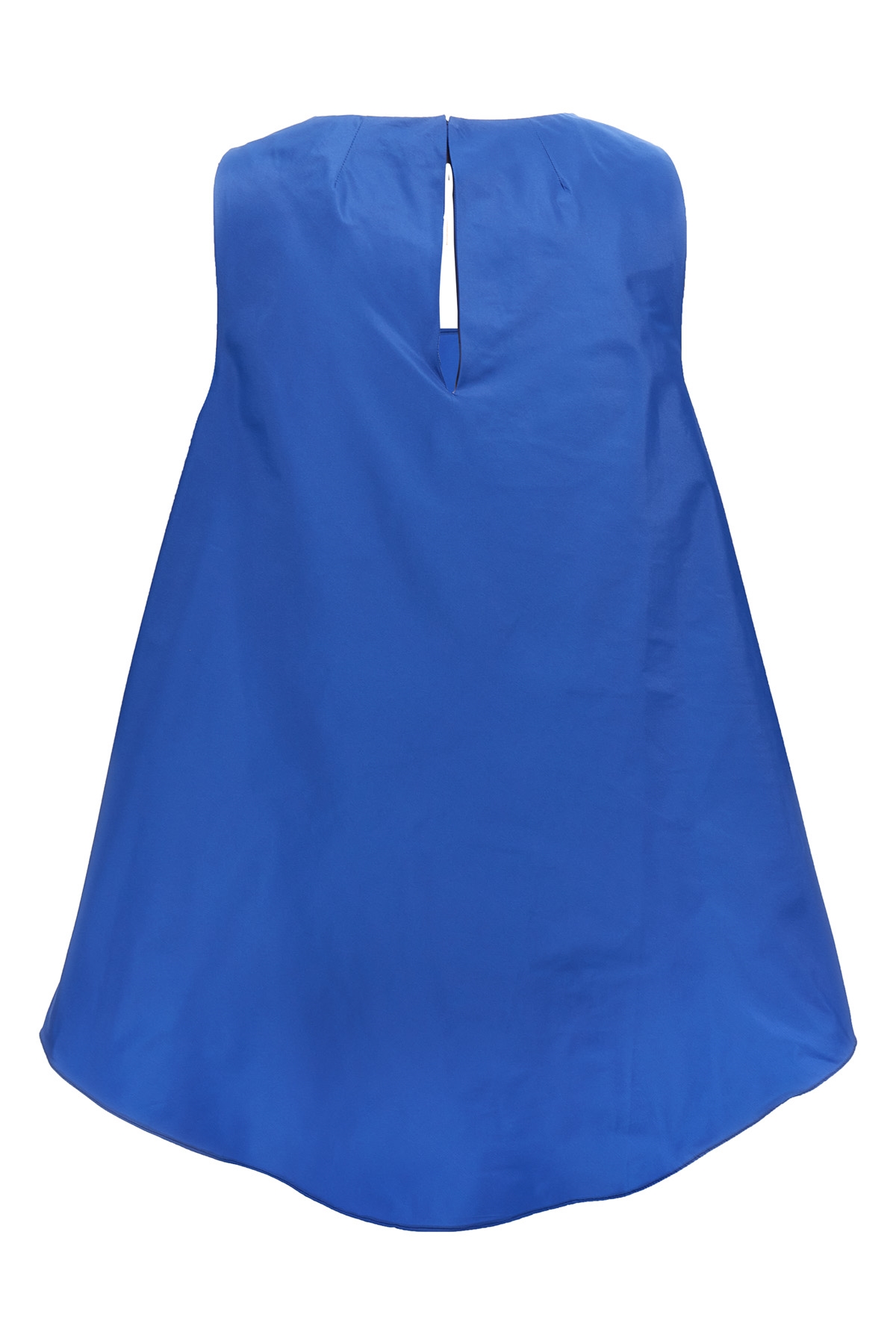 'Pimpy' cady fabric top with front ruffles, asymmetrical hem, back button closure with teardrop cut-out detail.