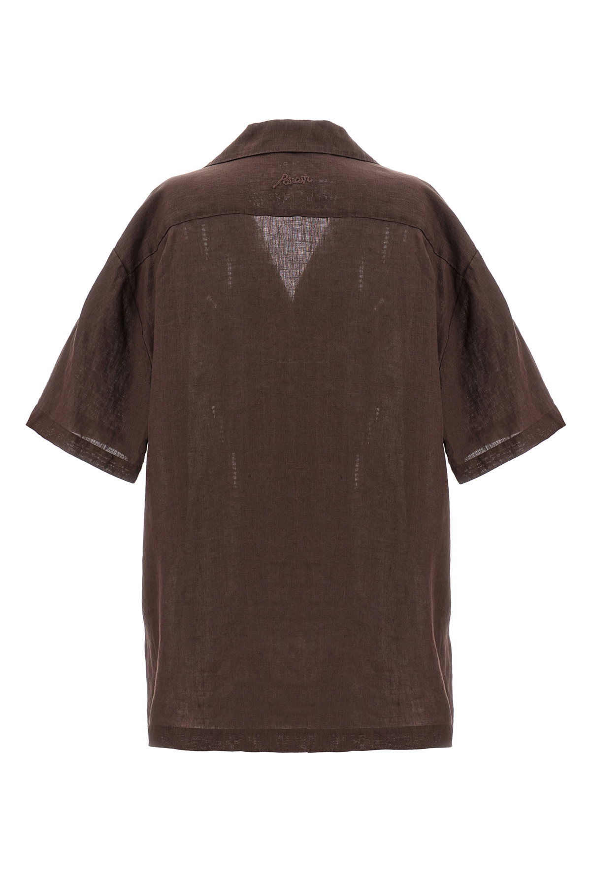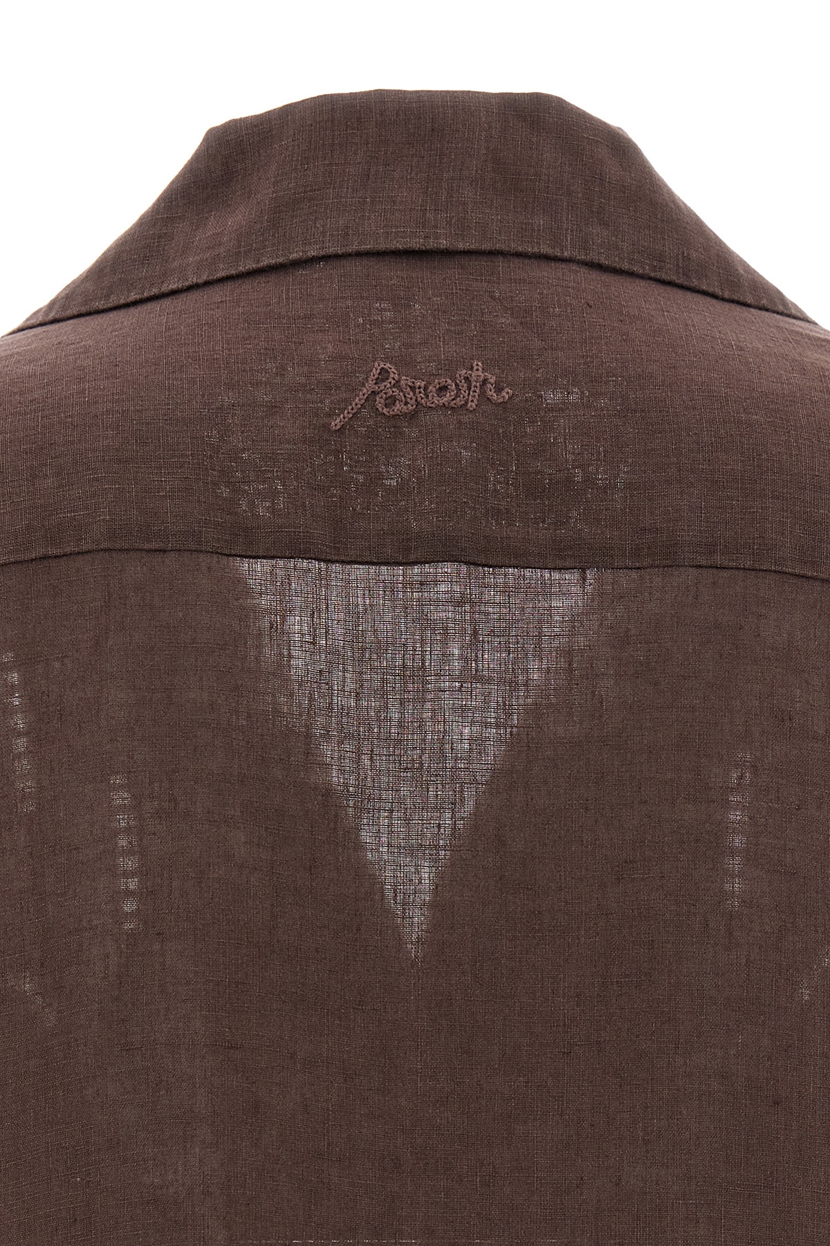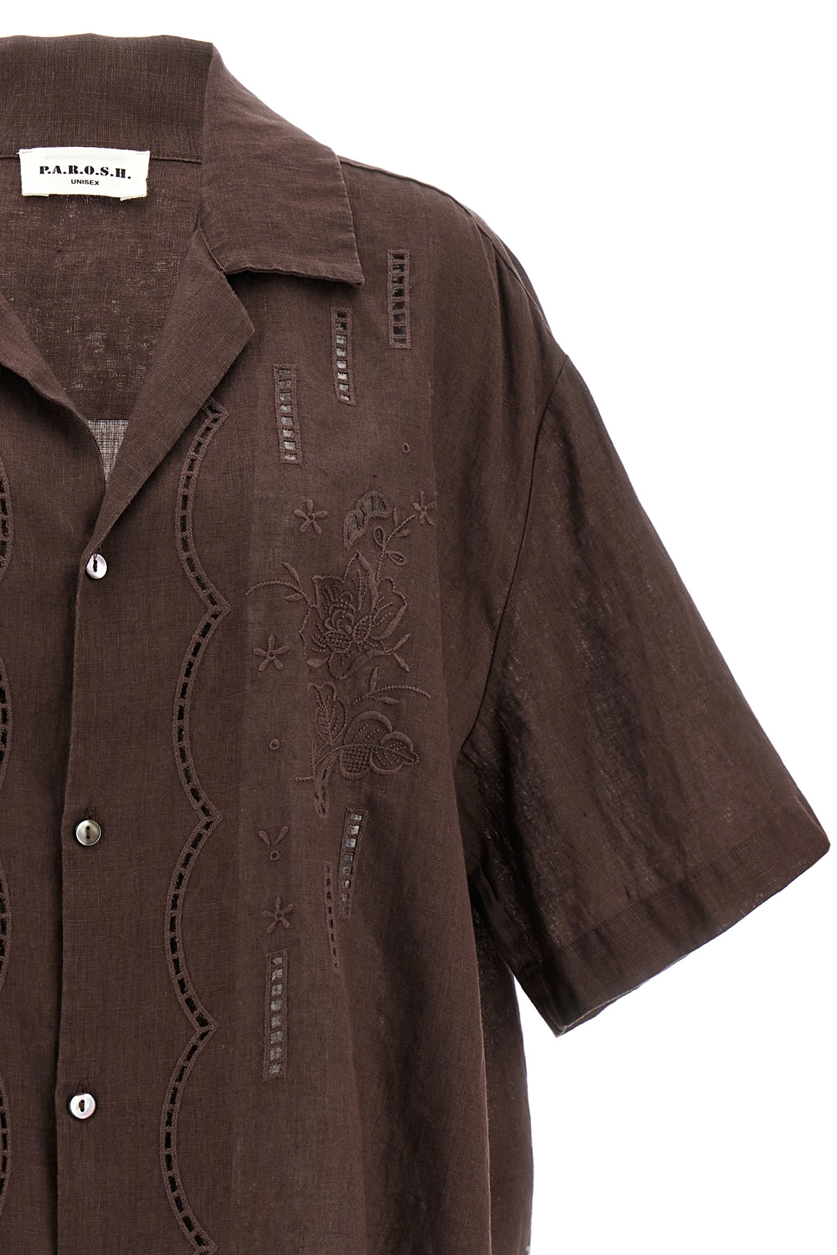 'Beach' embroidered linen shirt with button closure, short sleeves.