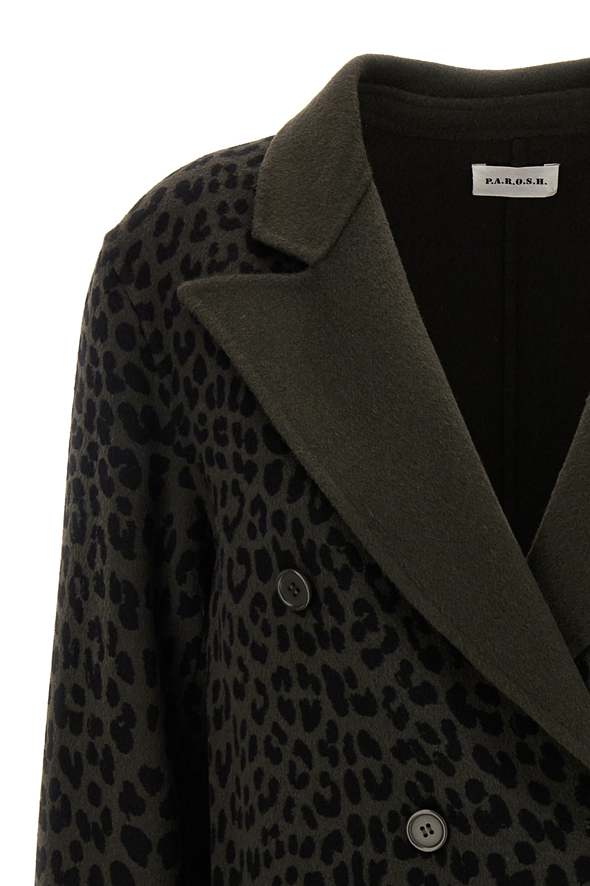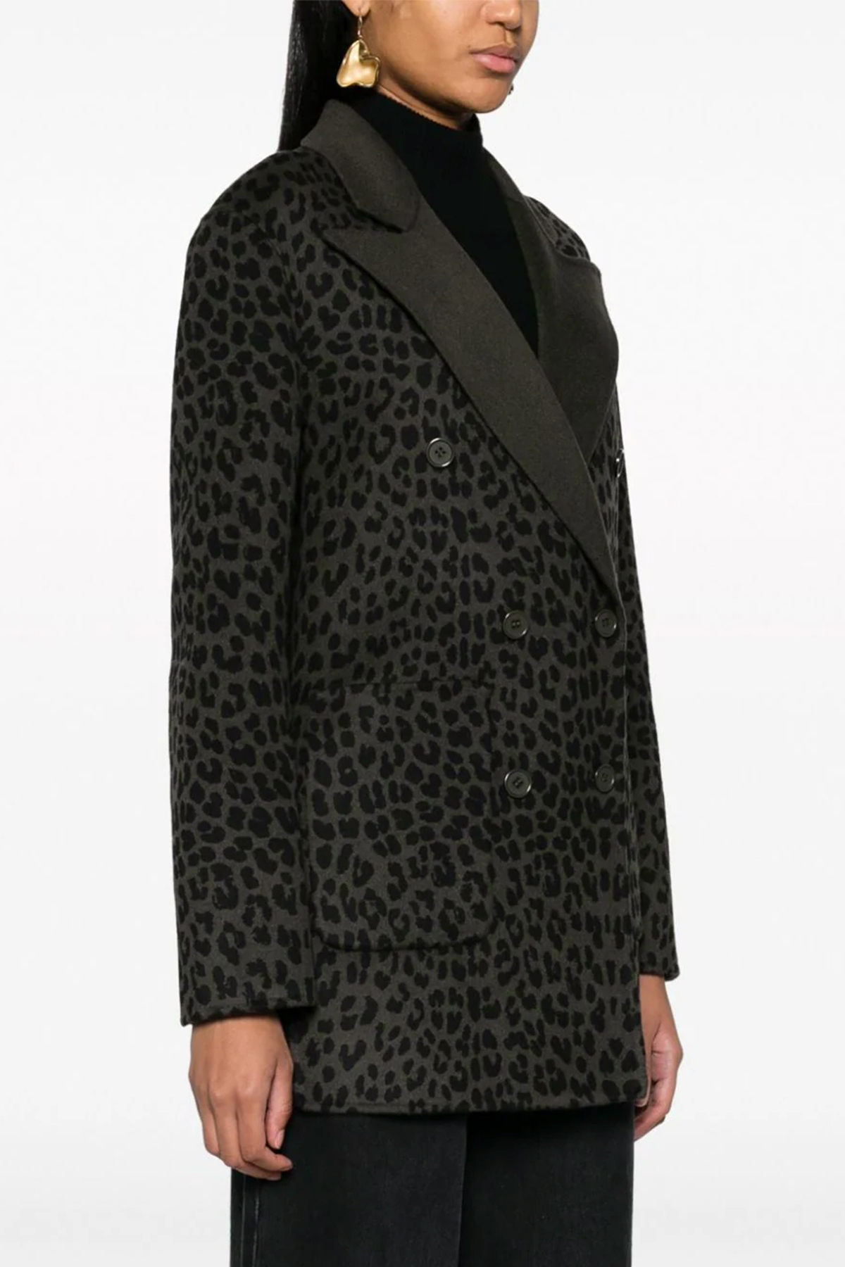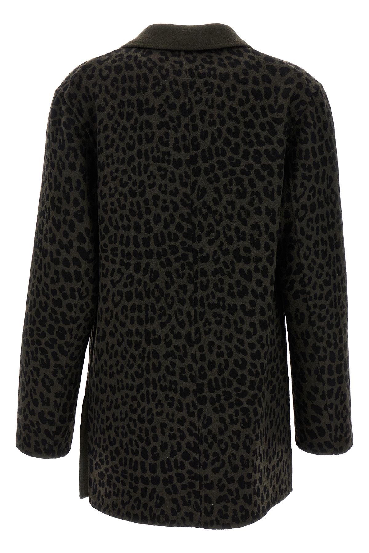 Double-breasted blazer in animal print wool with button closure, pockets, long sleeves.