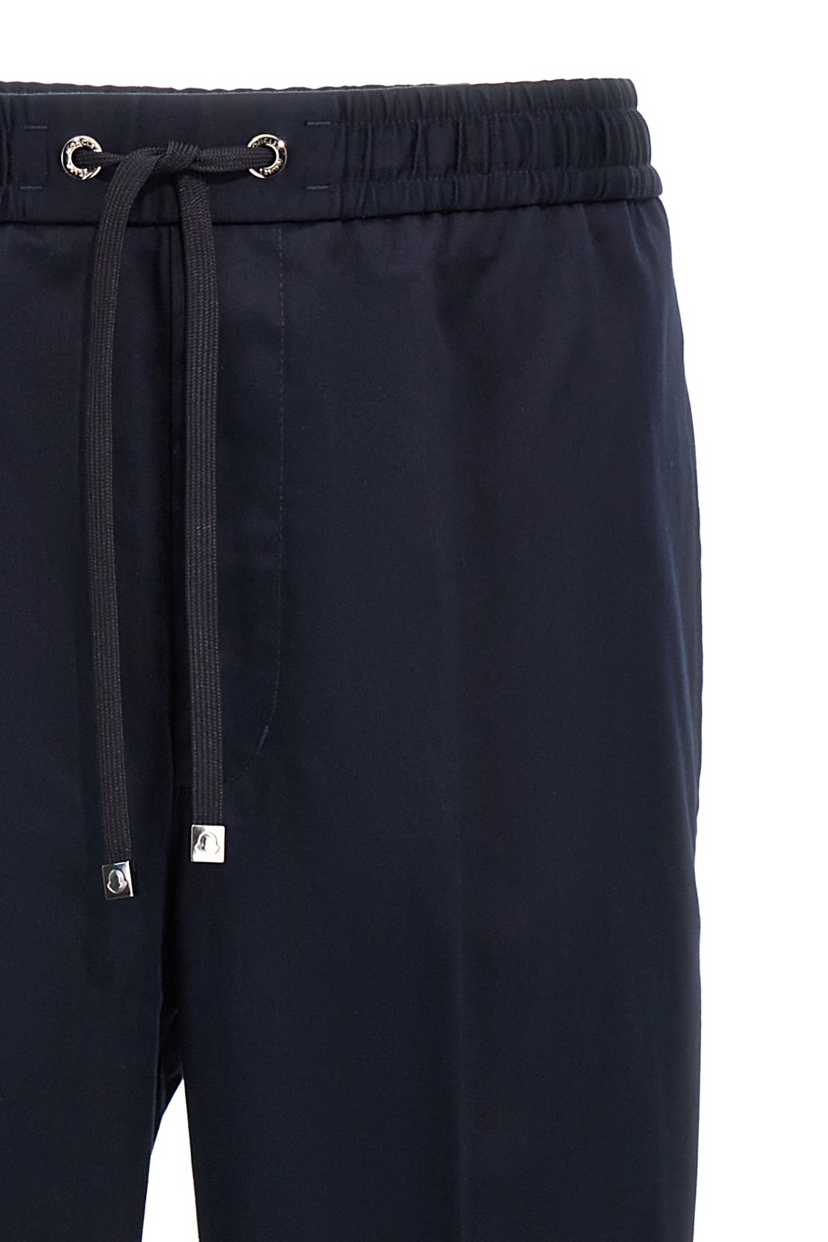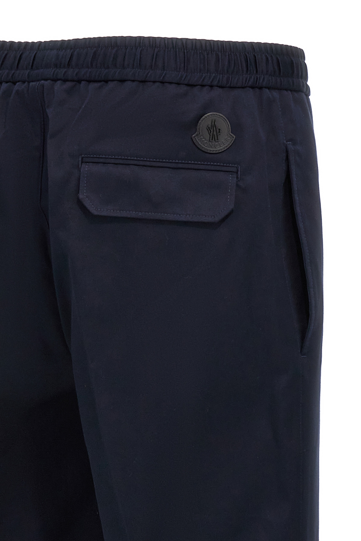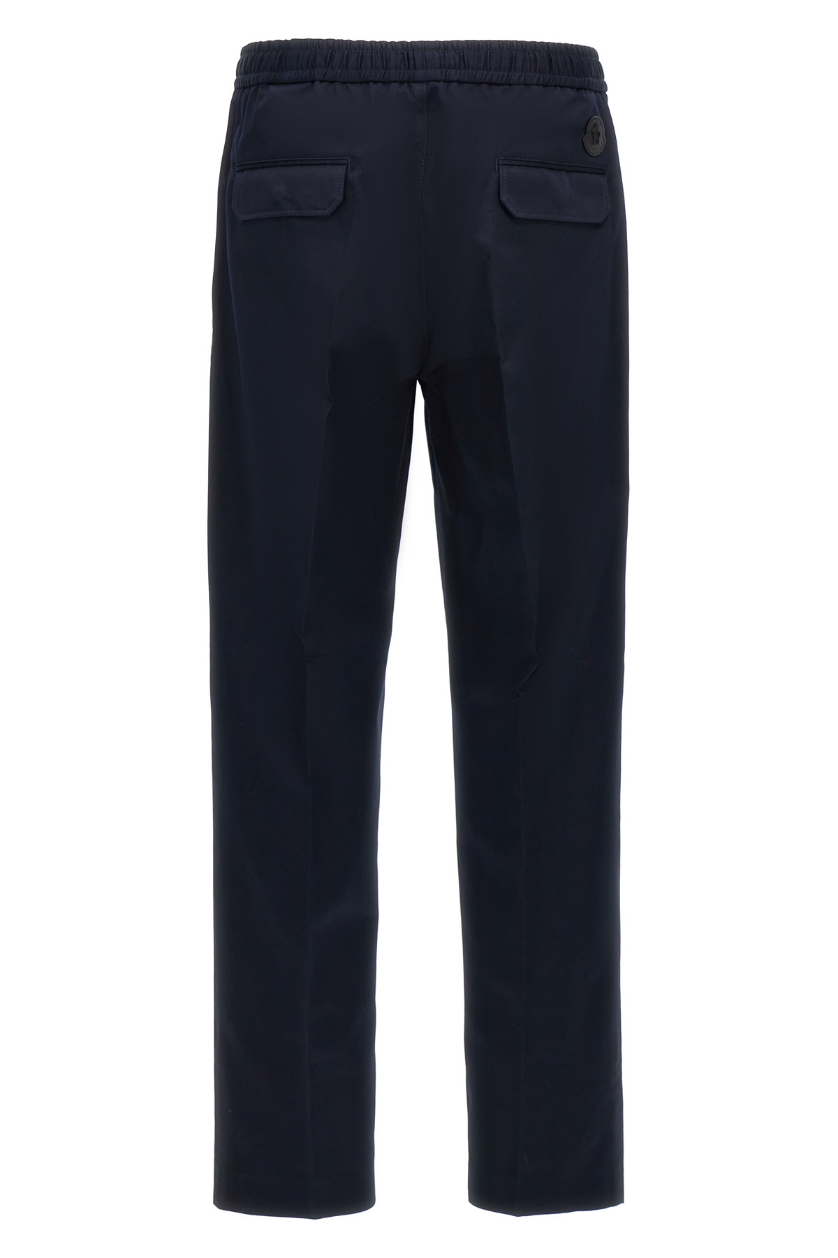 Cotton pants with leather logo patch at the back, elastic and drawstring at the waist, zip flap, pockets.