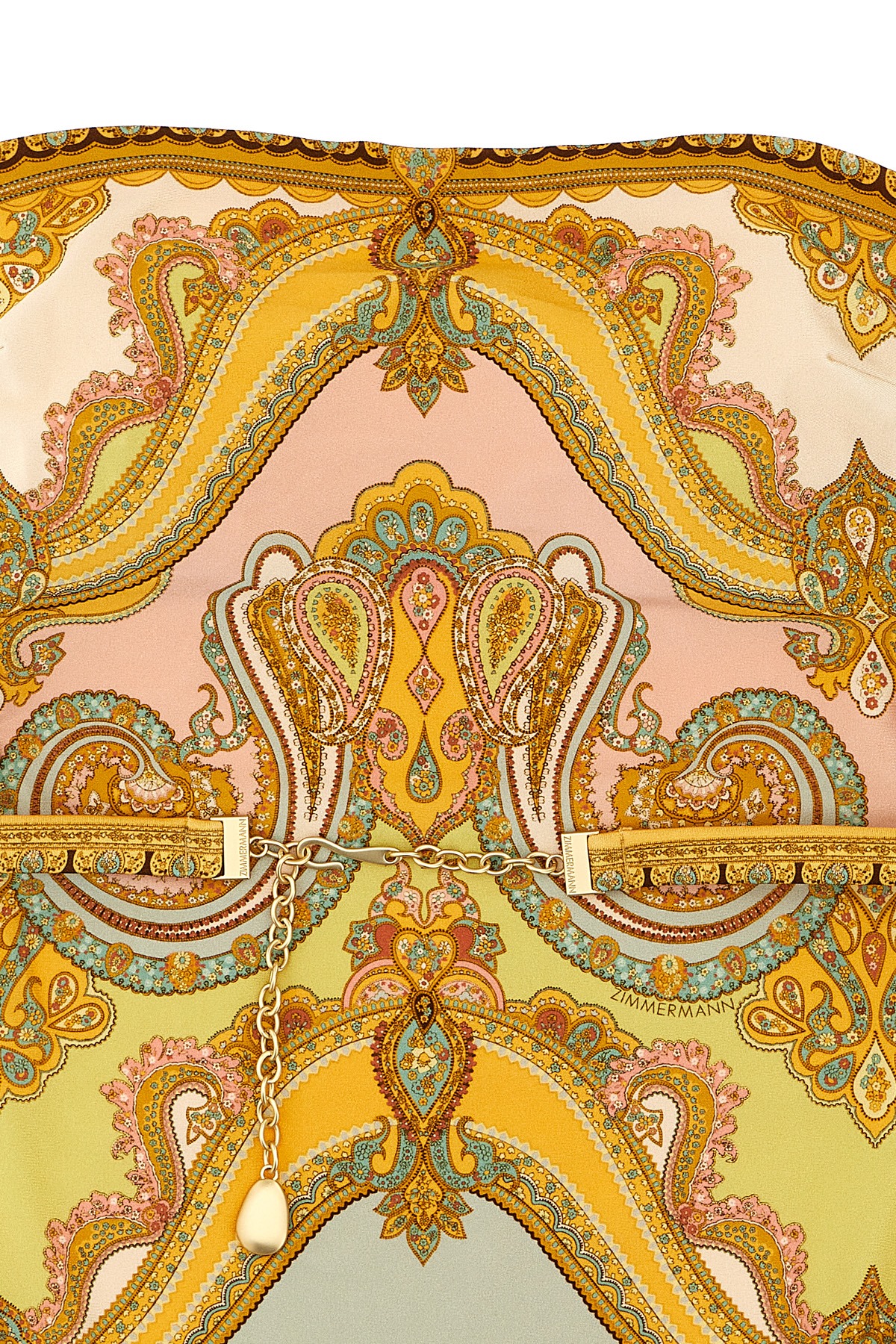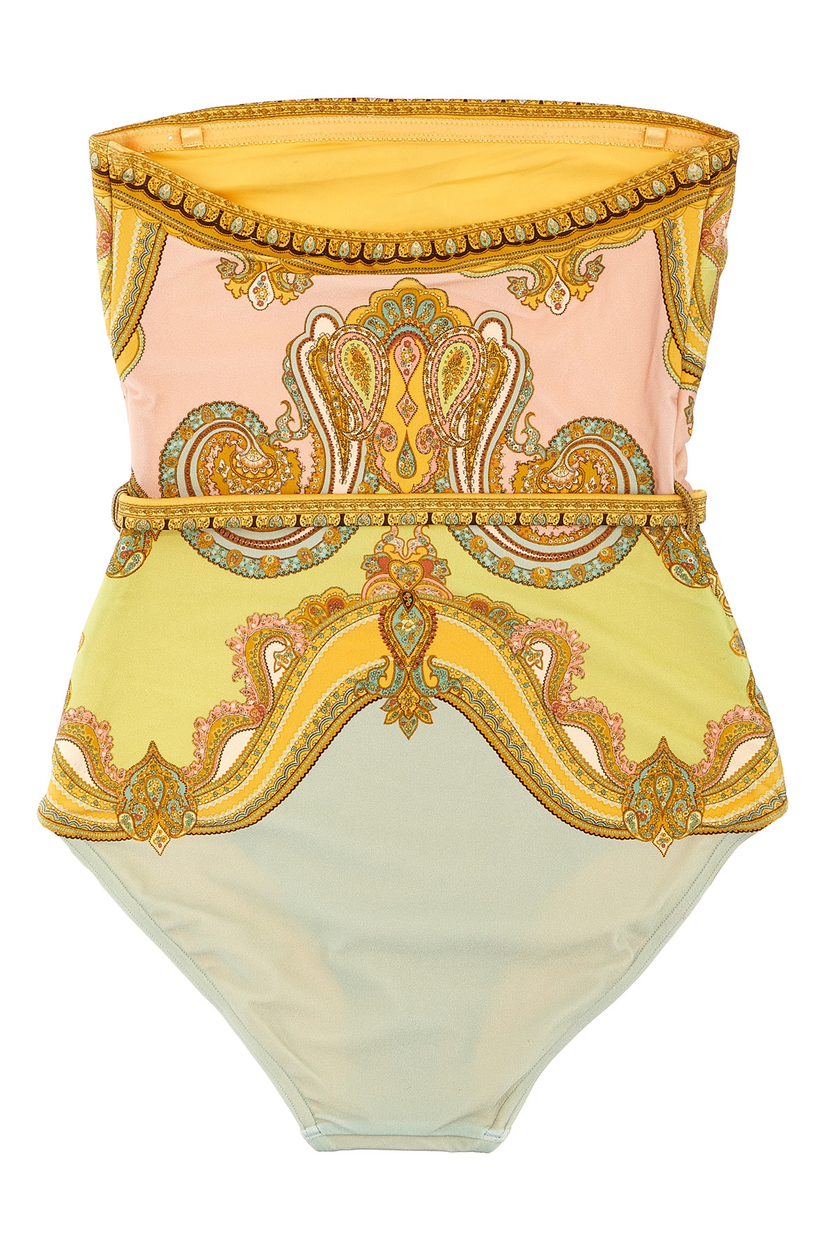 'Maxine Chain Trim Bandeau' Gold Paisley print Lycra one-piece swimsuit with adjustable and removable straps, adjustable and removable waist belt with metal details.