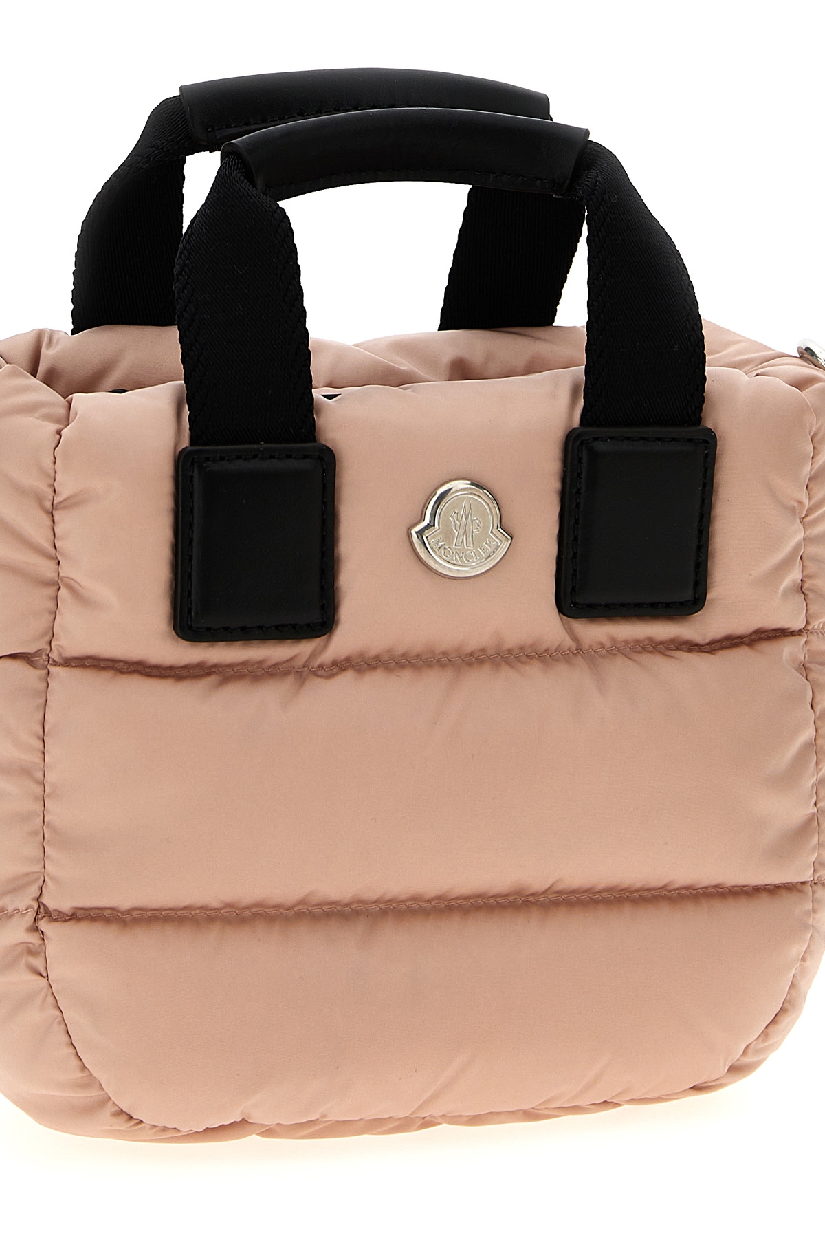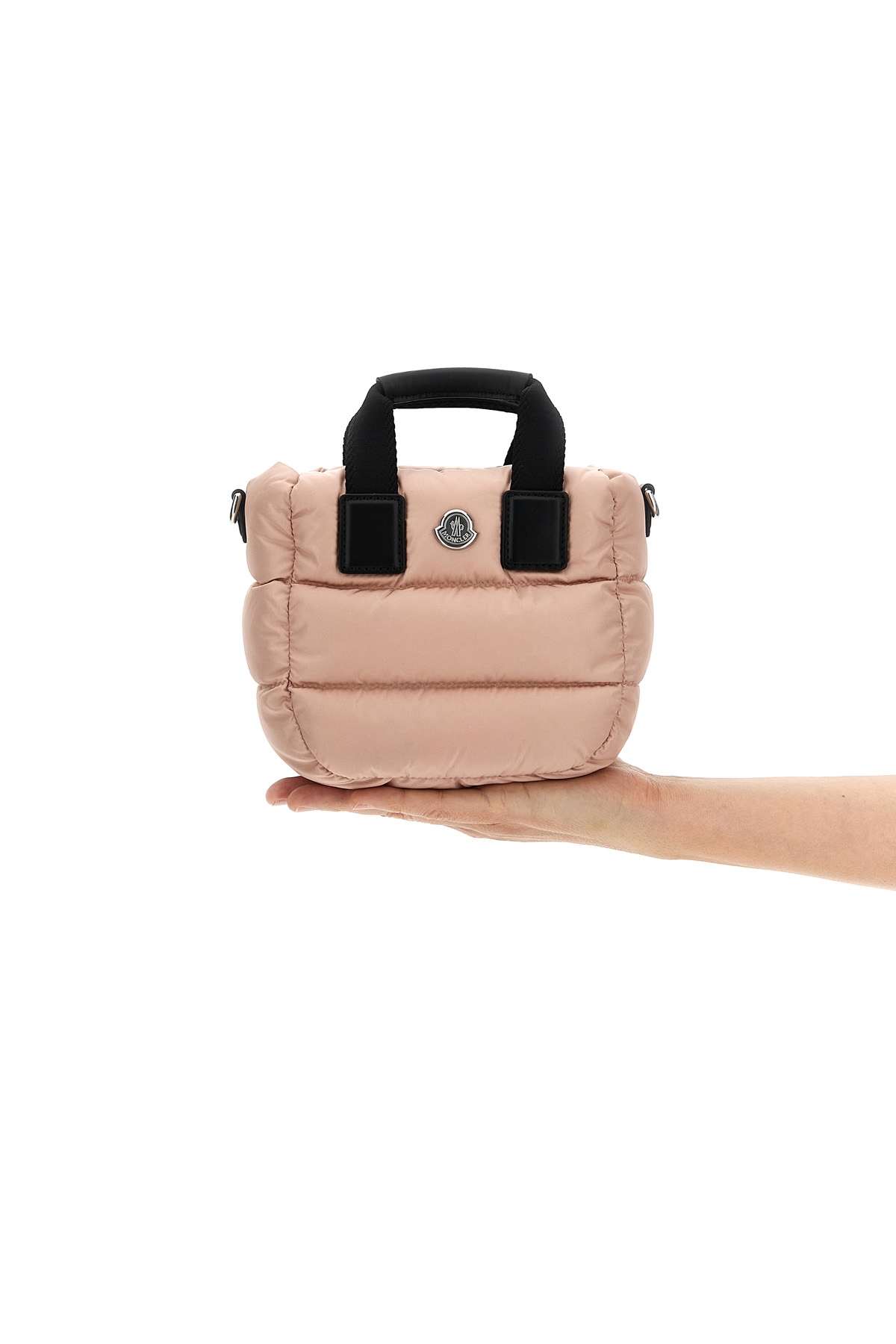 'Mini Caradoc' water-repellent padded quilted nylon handbag, front silver metal logo patch, cotton lining, double fixed handle with leather handle, zip closure, adjustable and removable leather shoulder strap.