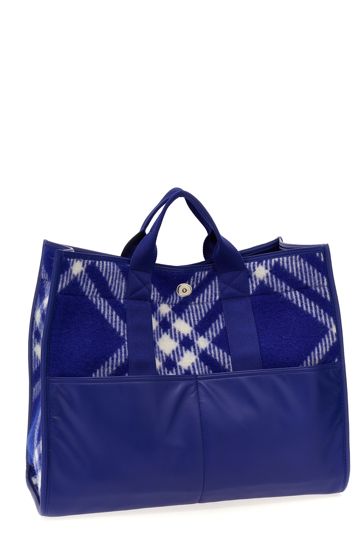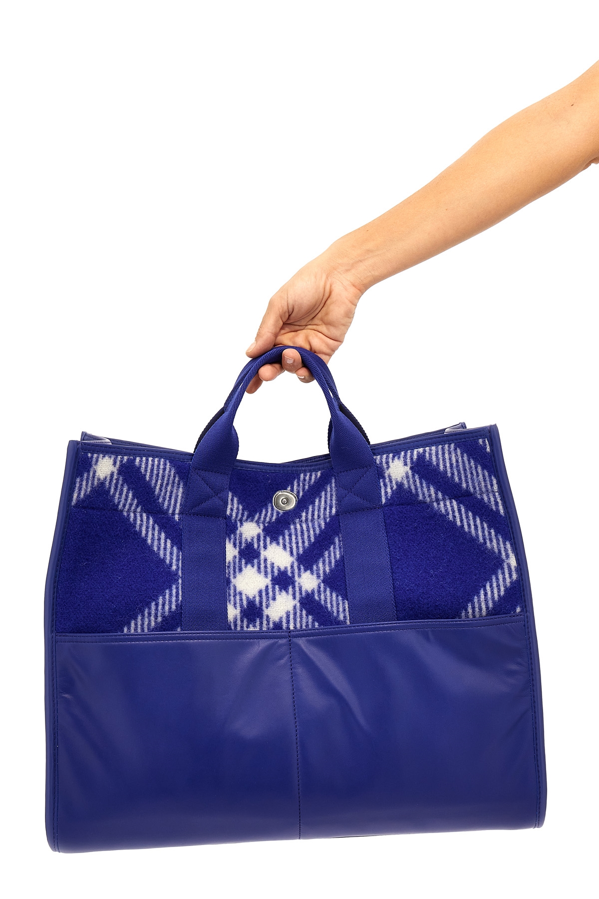 Wool shopping bag with check pattern, front pockets, and fabric handles.