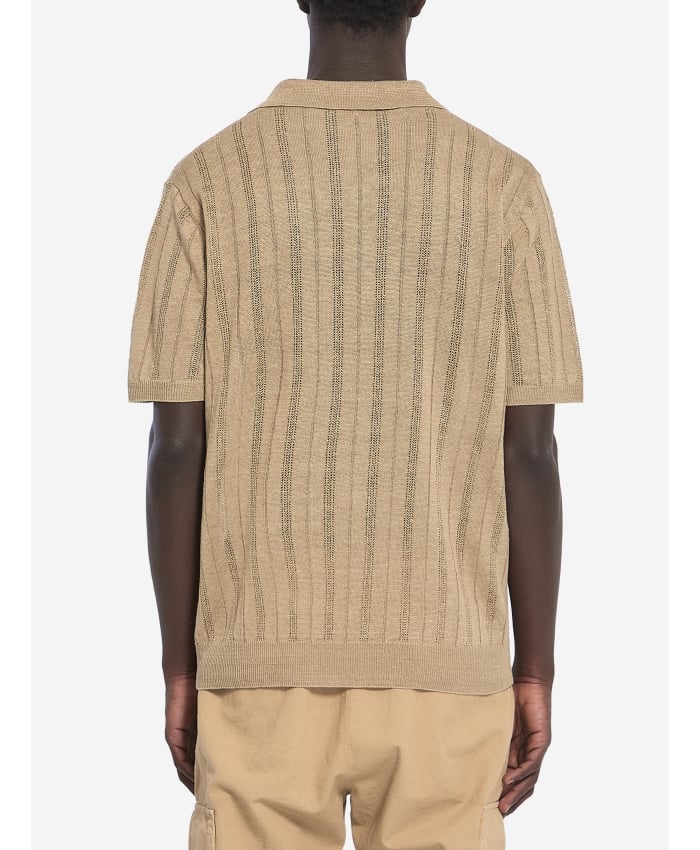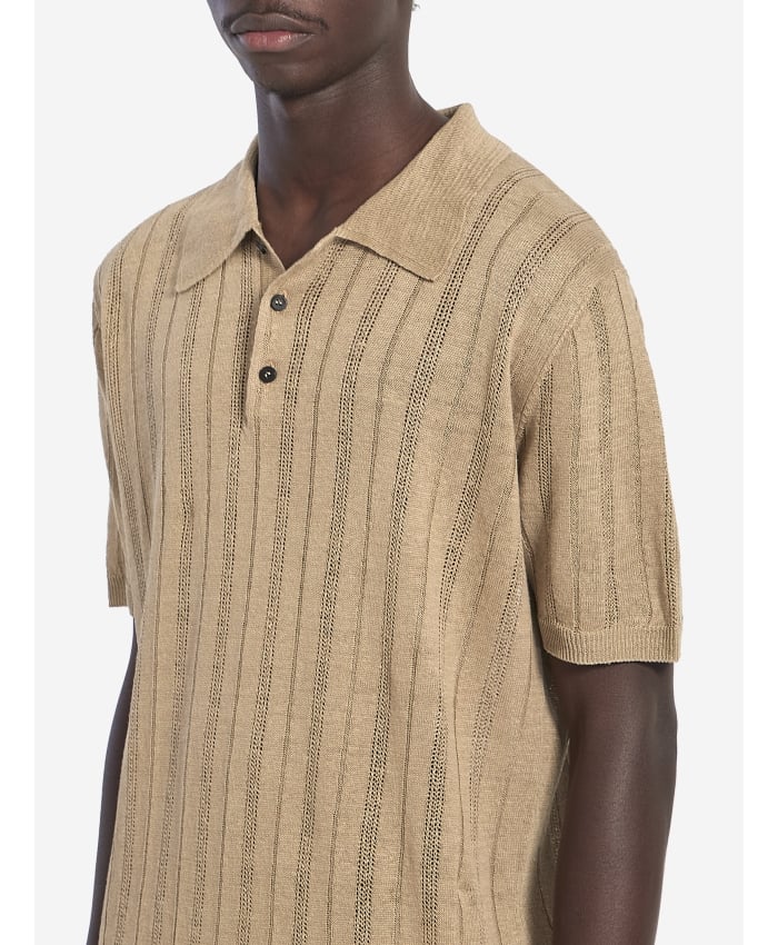 Lightweight sand-colored linen short-sleeve polo shirt with openwork knit detailing. It features a classic collar, a three-button placket, and ribbed