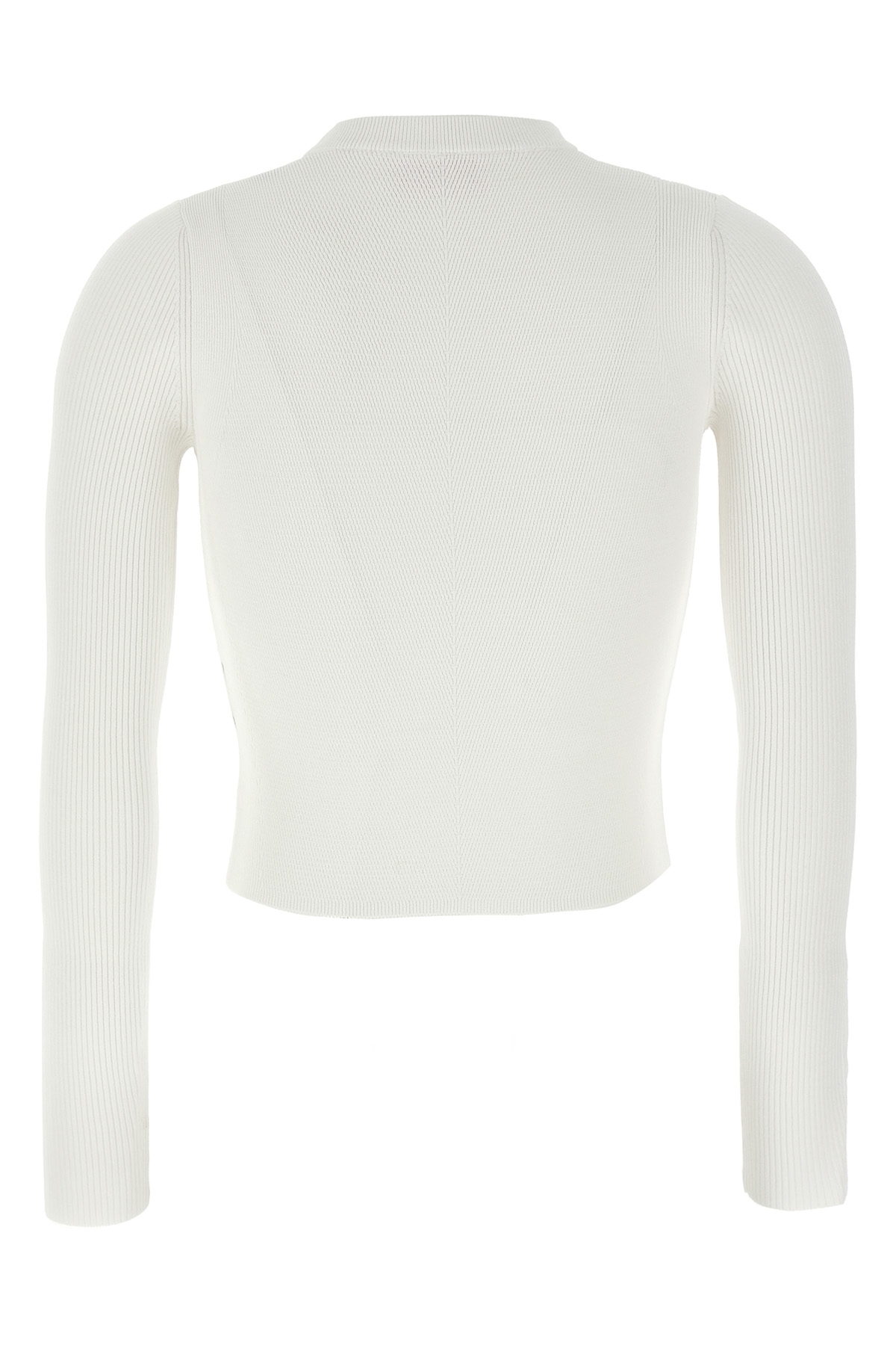 'M-Valari' ribbed stretch fabric top with front metal logo plaque with cut-out detail, crew neck, long sleeves.