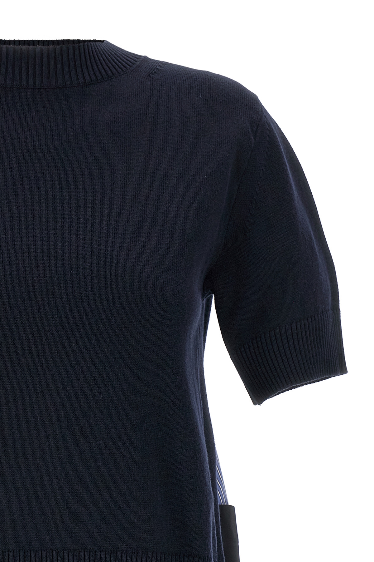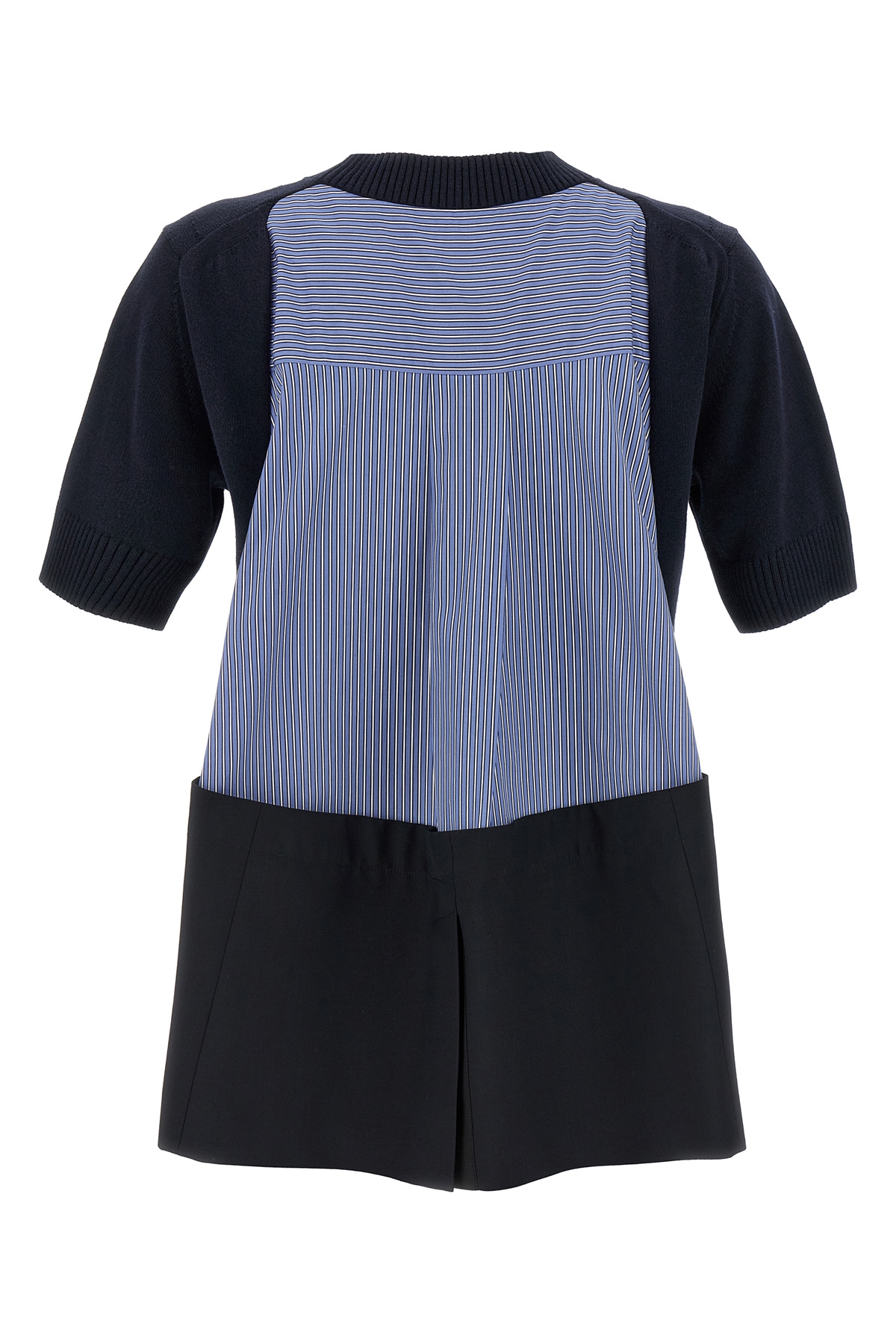 Asymmetrical cotton blend sweater with patchwork panels at the back, crew neck, split and inner mesh at the back, and short sleeves.