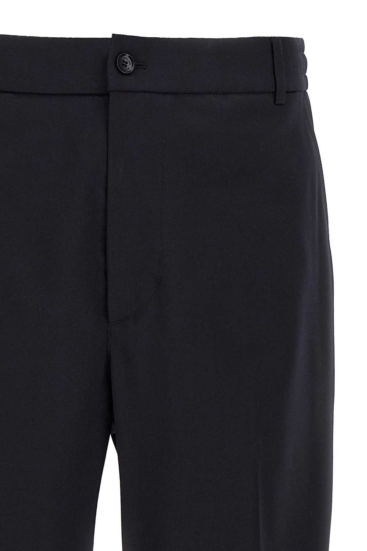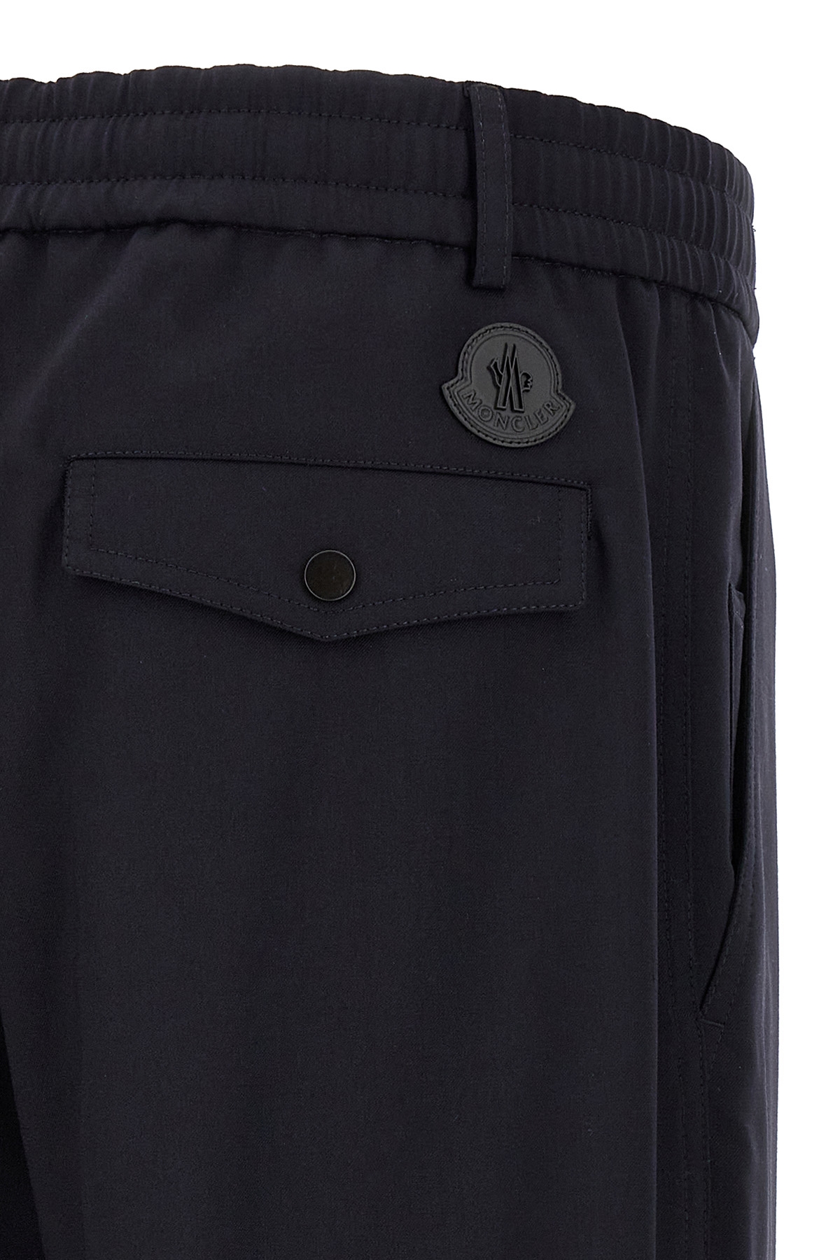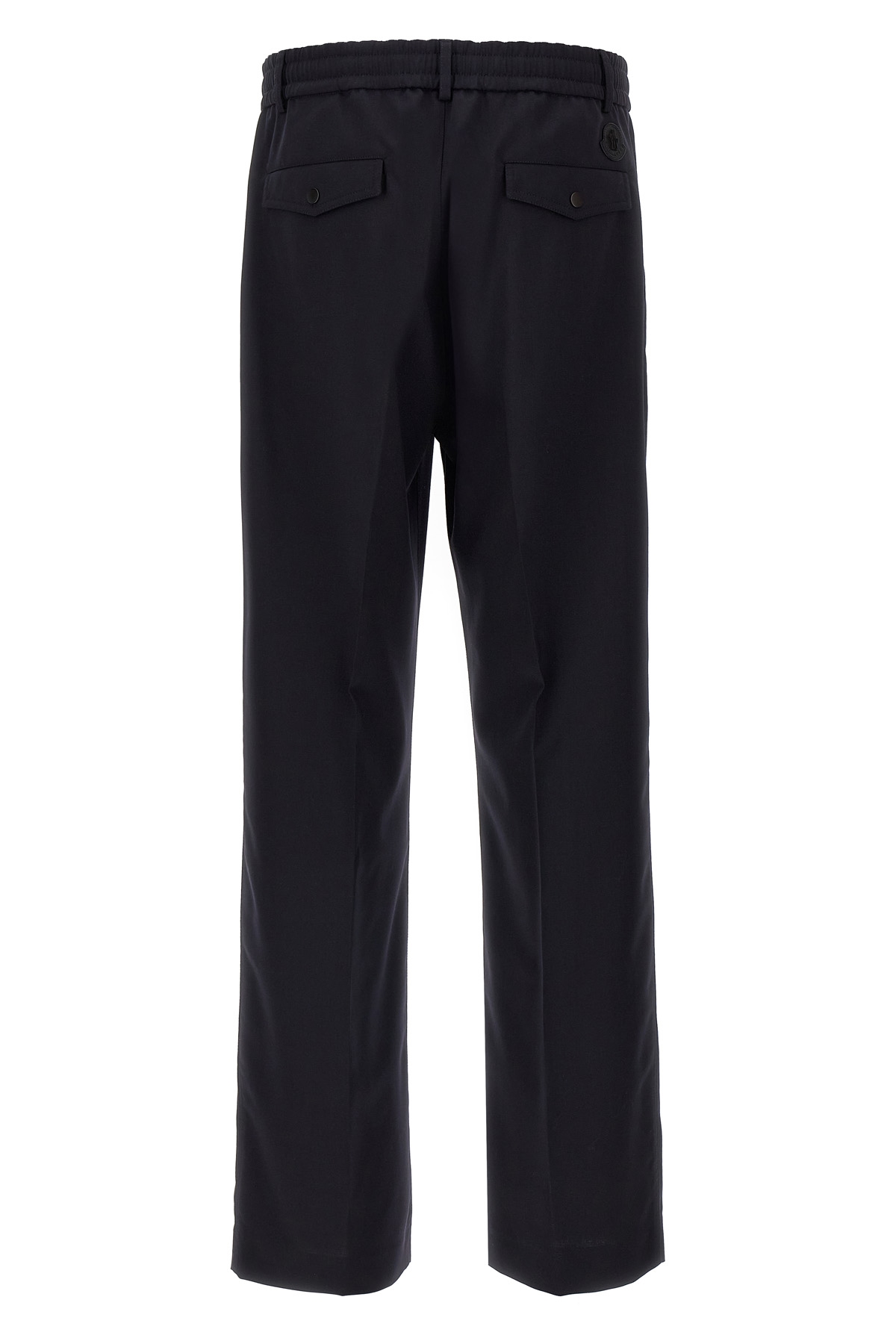 Stretch wool gabardine pants, adjustable drawstring elastic at the waist, zip and button closure, stretched pleat, pockets, back leather logo patch.