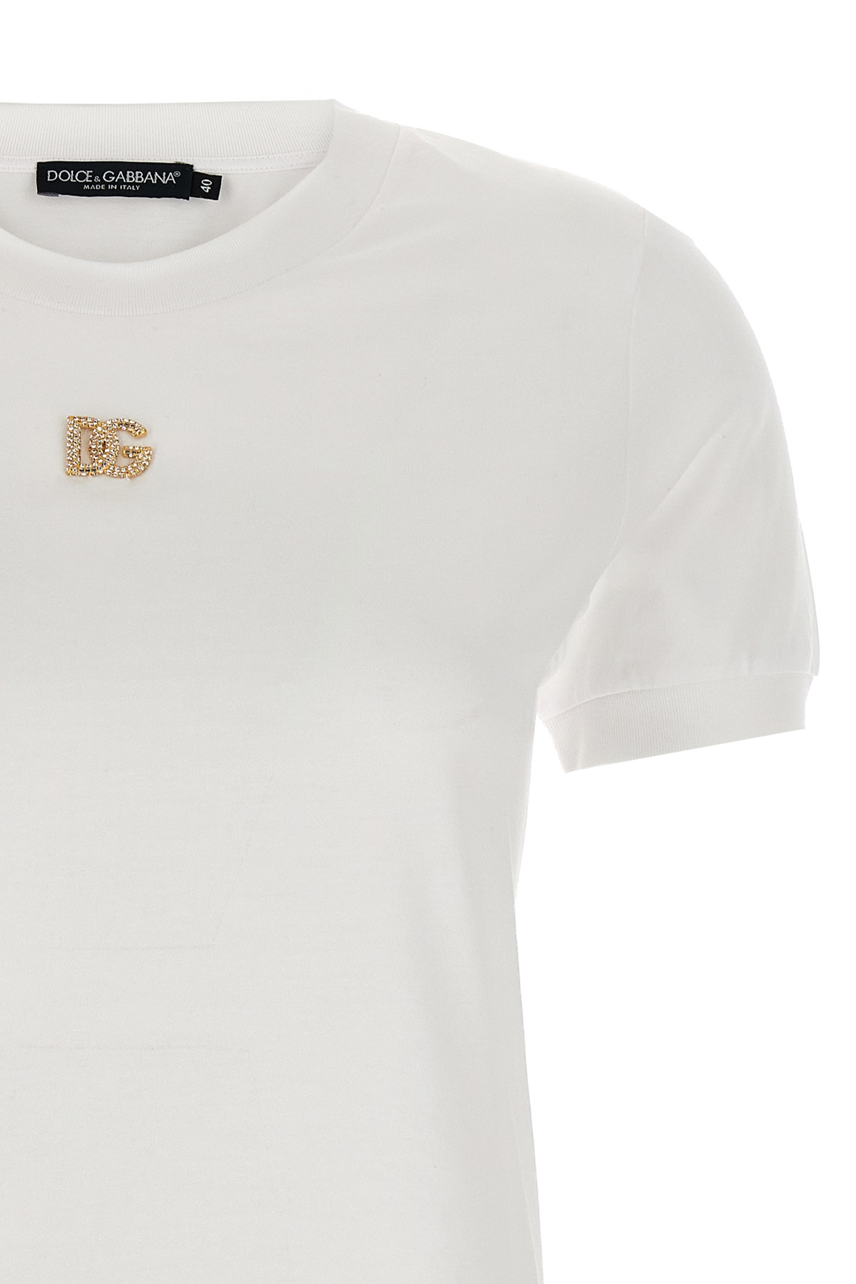 Cotton T-shirt, metal and rhinestone logo on the front, crew neck, short sleeves with cuffs.