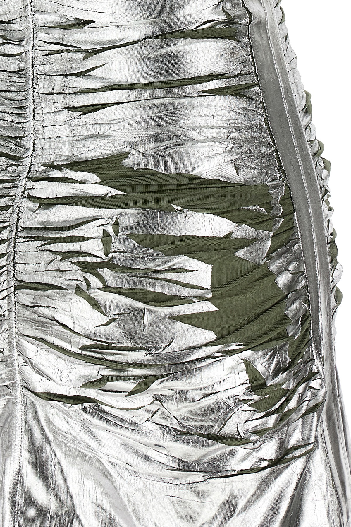 'D-Iamante' mini dress in curled stretch jersey covered with a shiny Mylar film to create contrasts with the underlying fabric, V-neck, sleeveless with thin adjustable straps, metallic Oval D charm.
