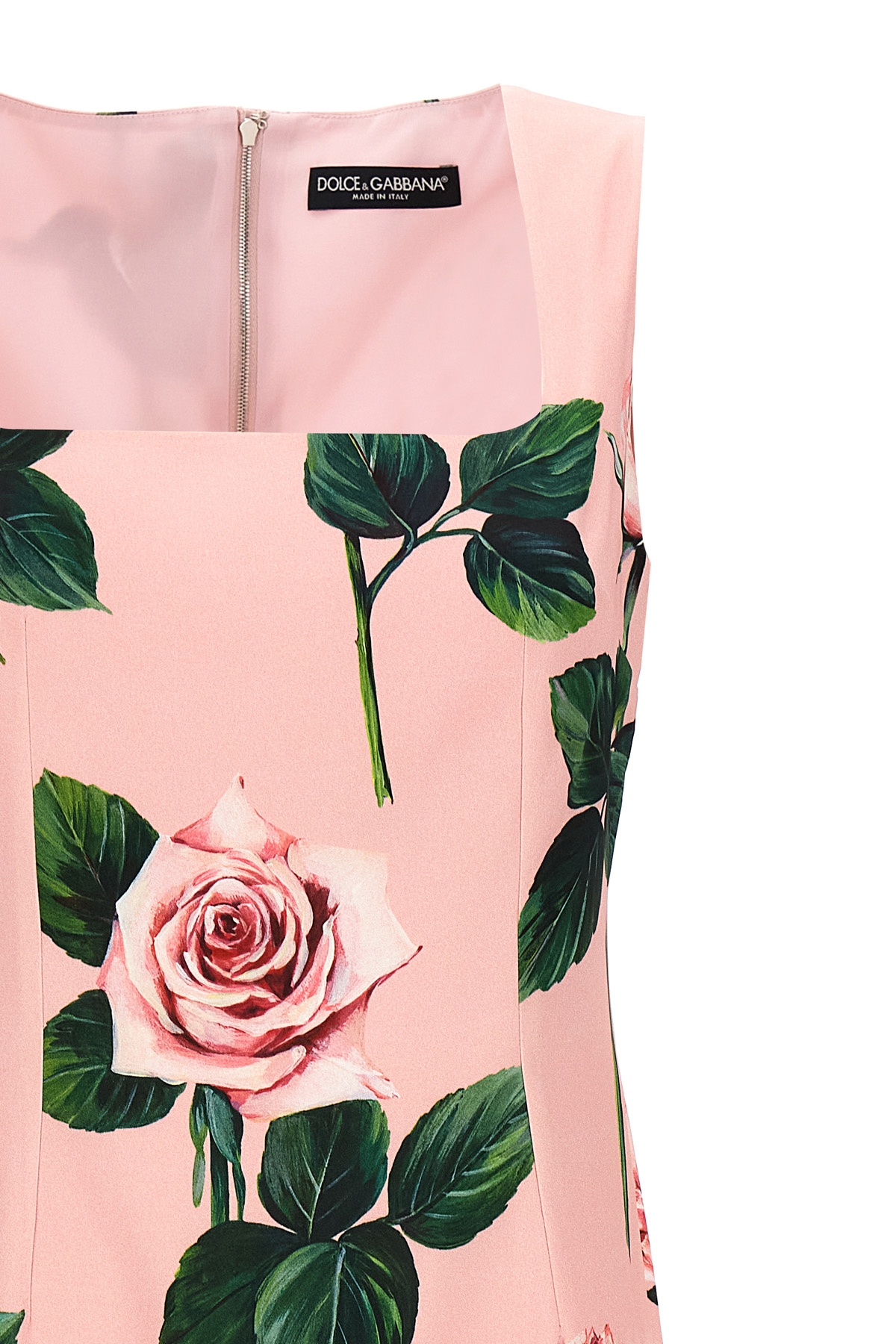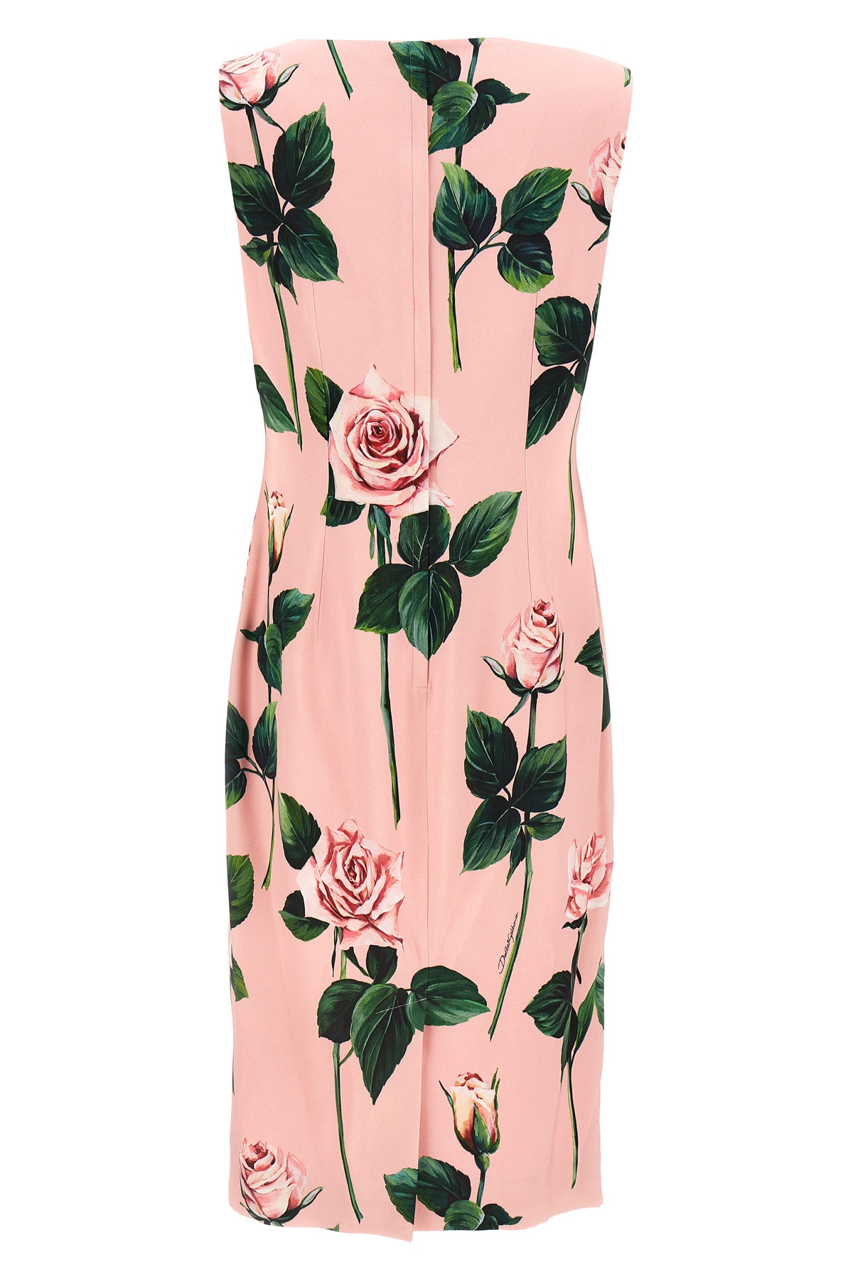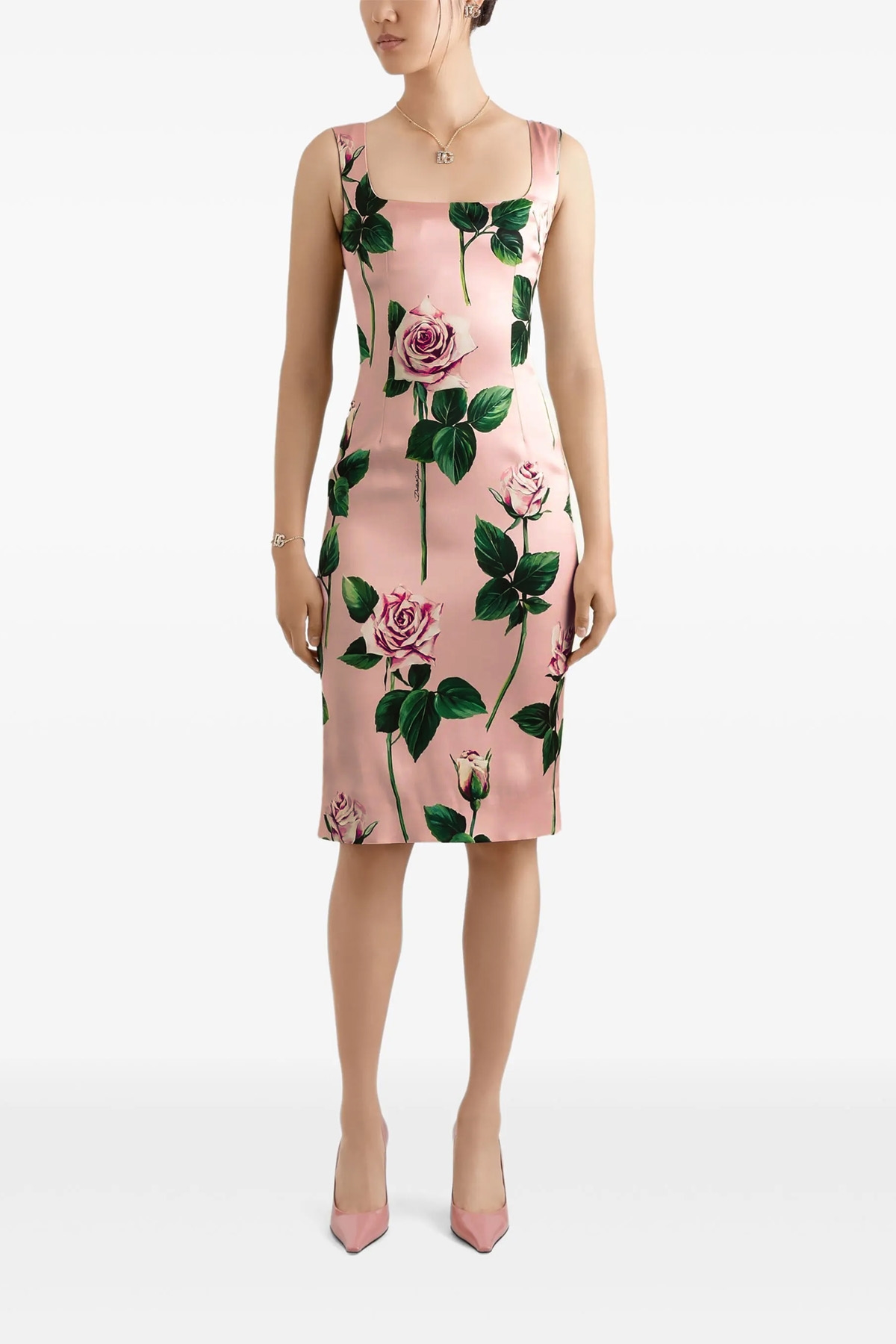Floral print viscose charmeuse dress with sleeveless sheath dress with silk crepe de chine lining, square neckline, zip closure and back split.