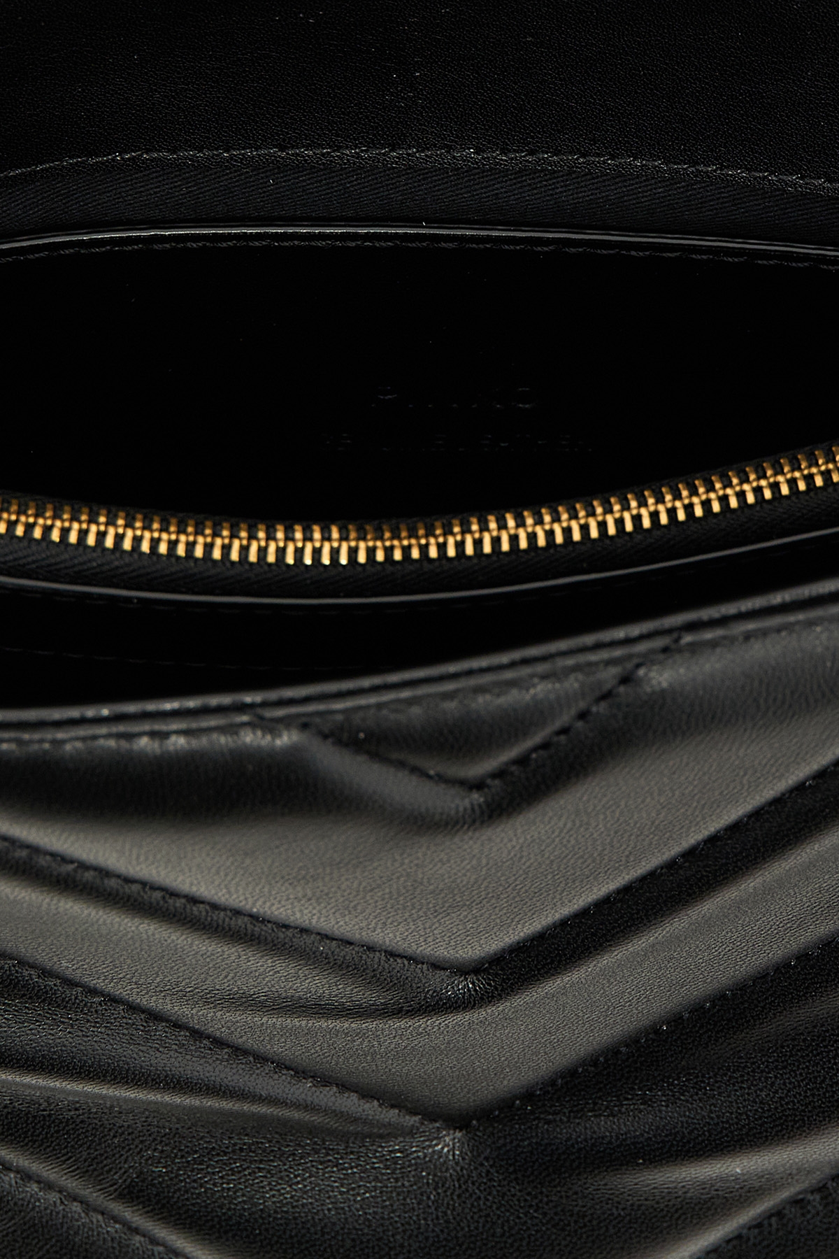 'Love Click Classic' leather crossbody bag with chevron pattern, magnetic flap closure with cut-out metal hardware, chain shoulder strap with adjustable leather protection.