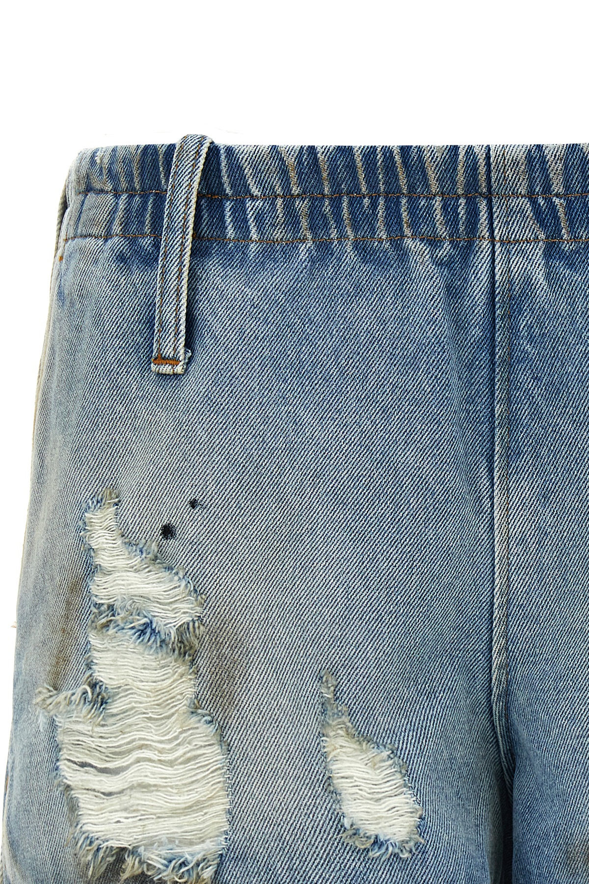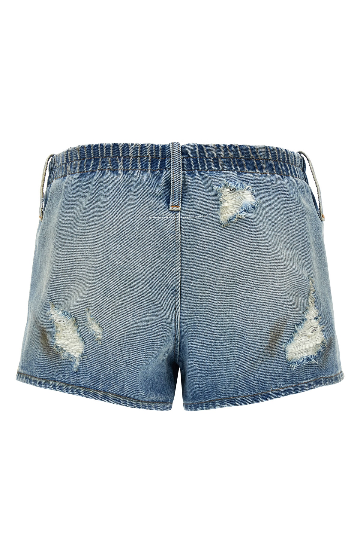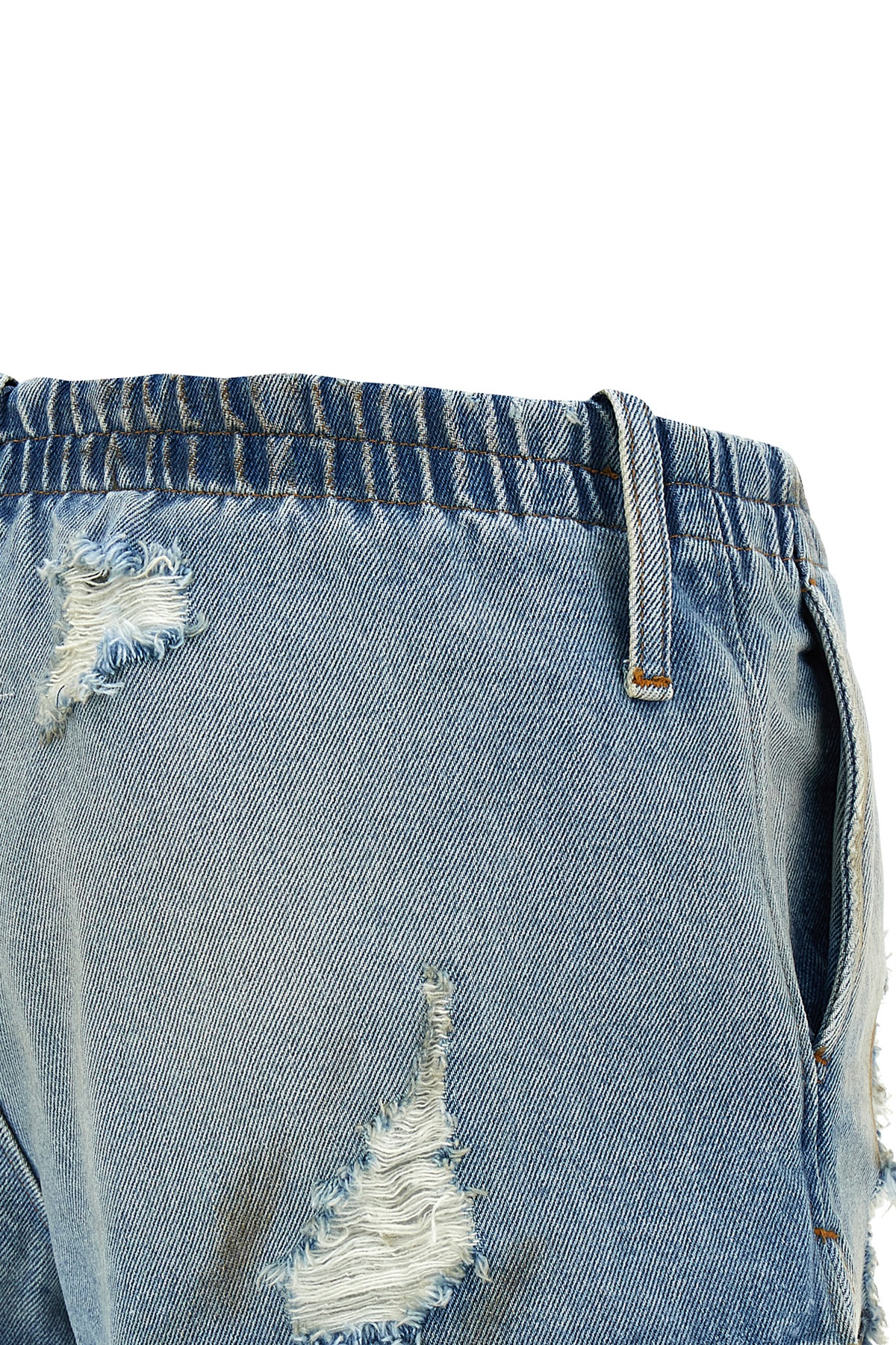 Shorts in used-effect cotton denim with rips and stains, elastic waistband, pockets, side slits.