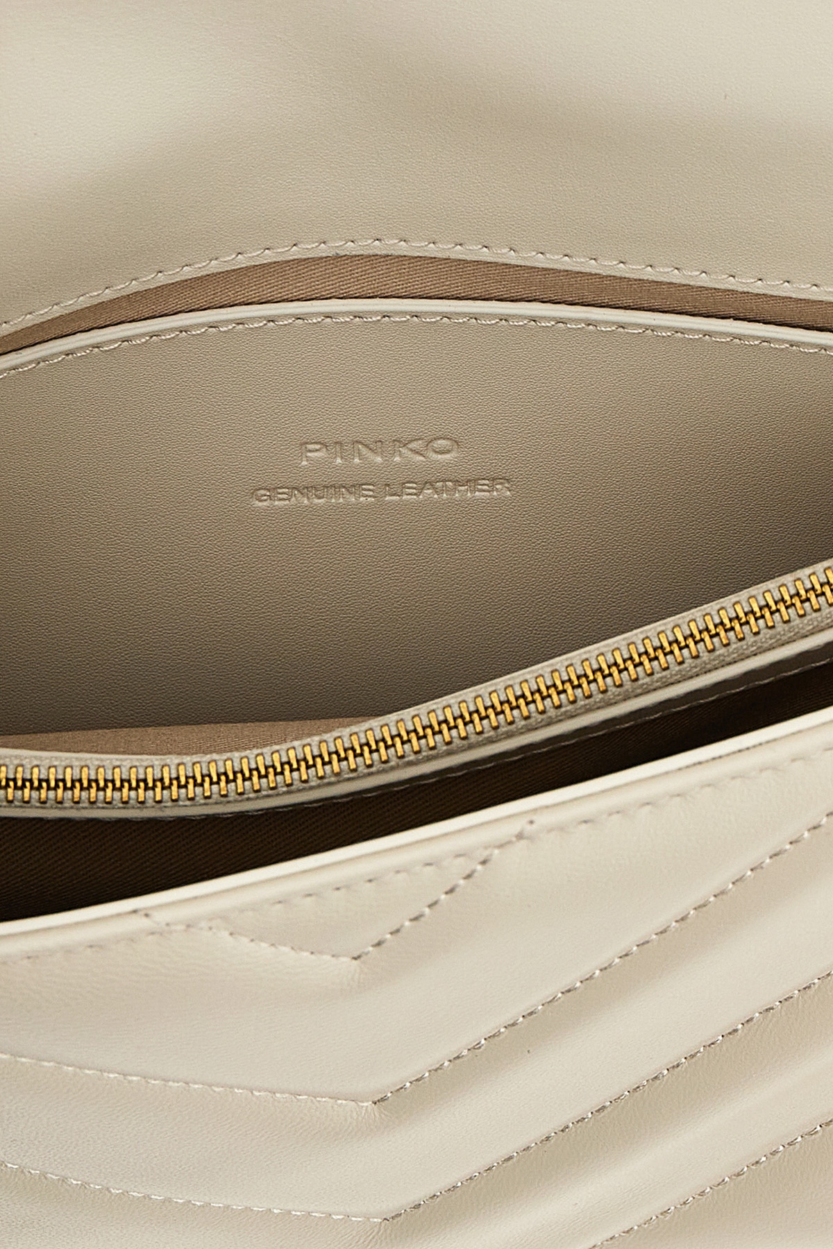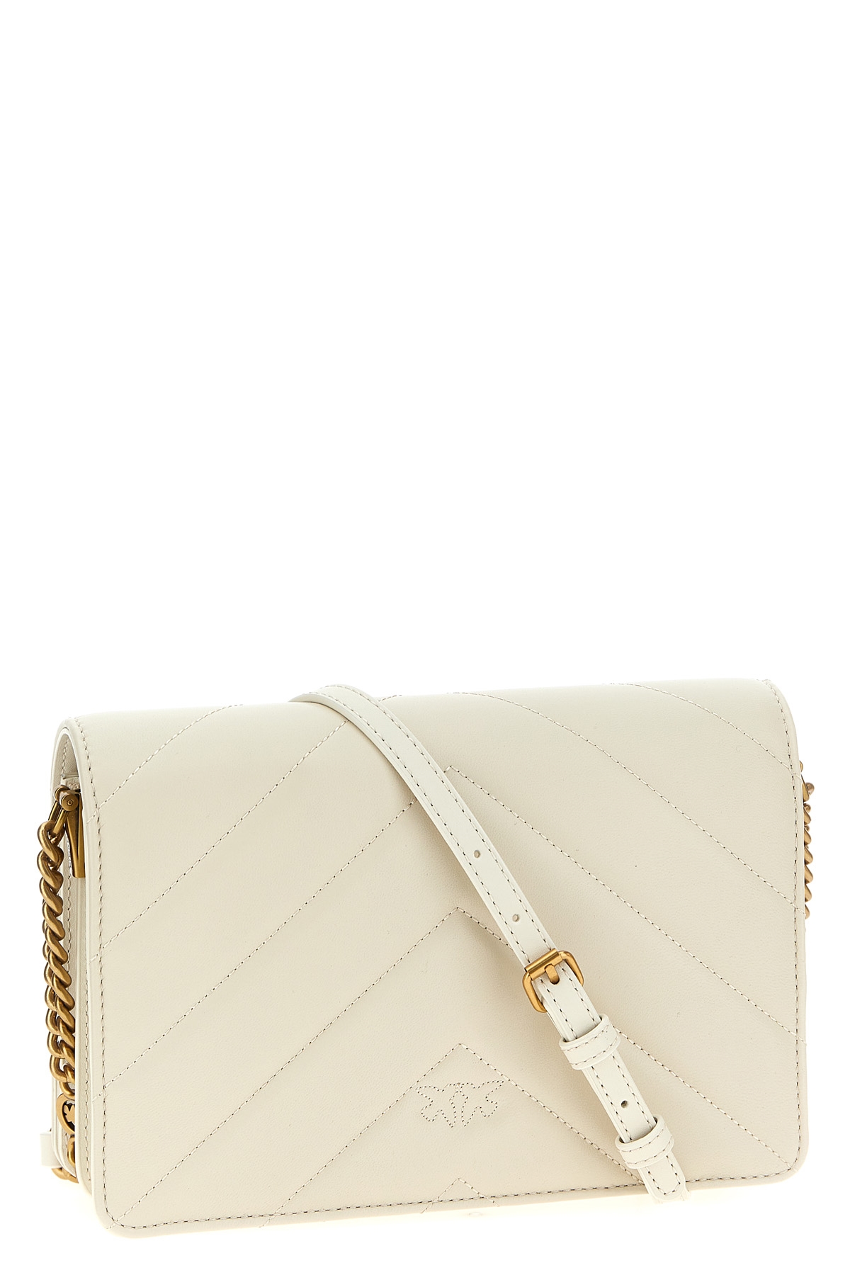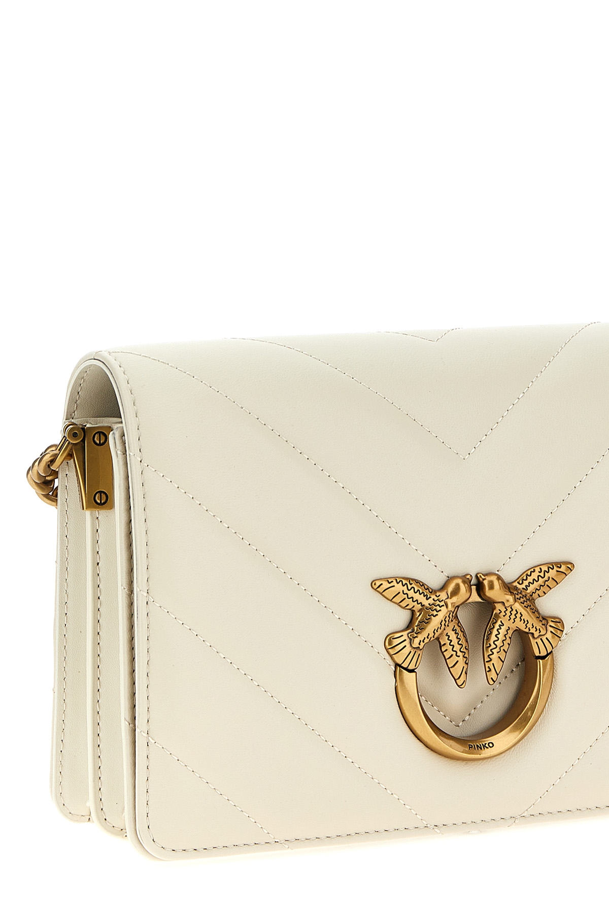 'Love Click Classic' leather crossbody bag with chevron pattern, magnetic flap closure with cut-out metal hardware, chain shoulder strap with adjustable leather protection.
