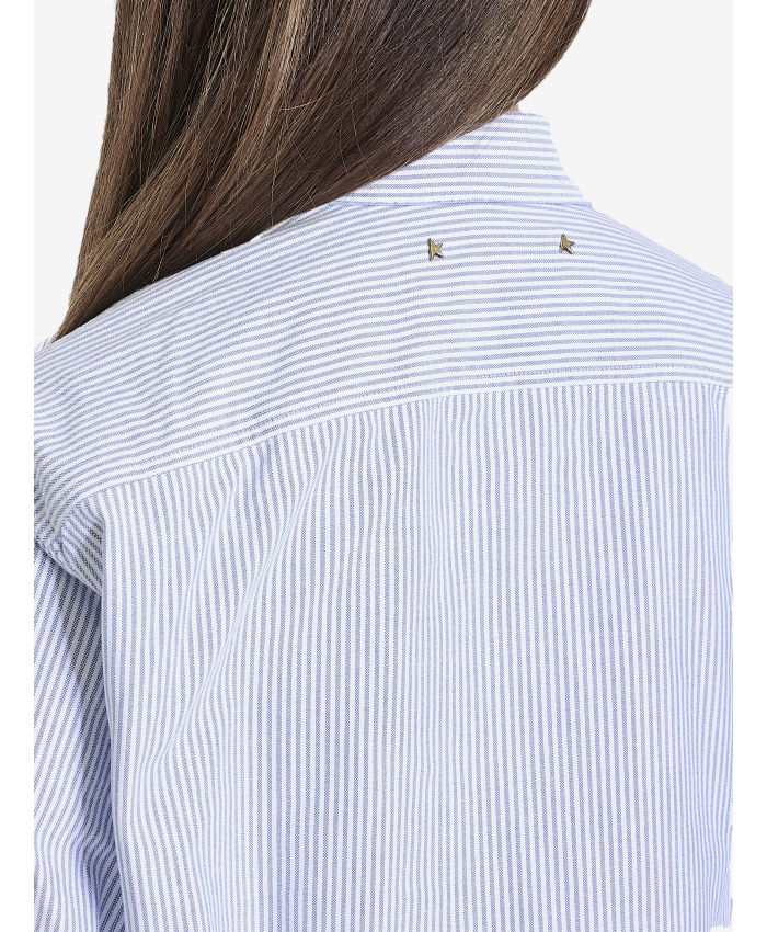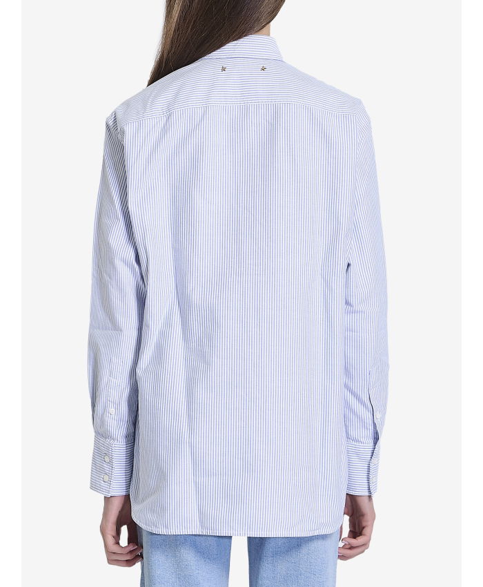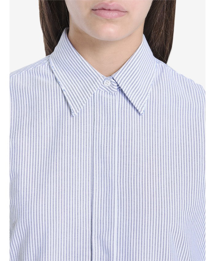 White and light-blue striped cotton shirt. It features pointed collar, front concealed button closure and curved hem. Double star at the back.