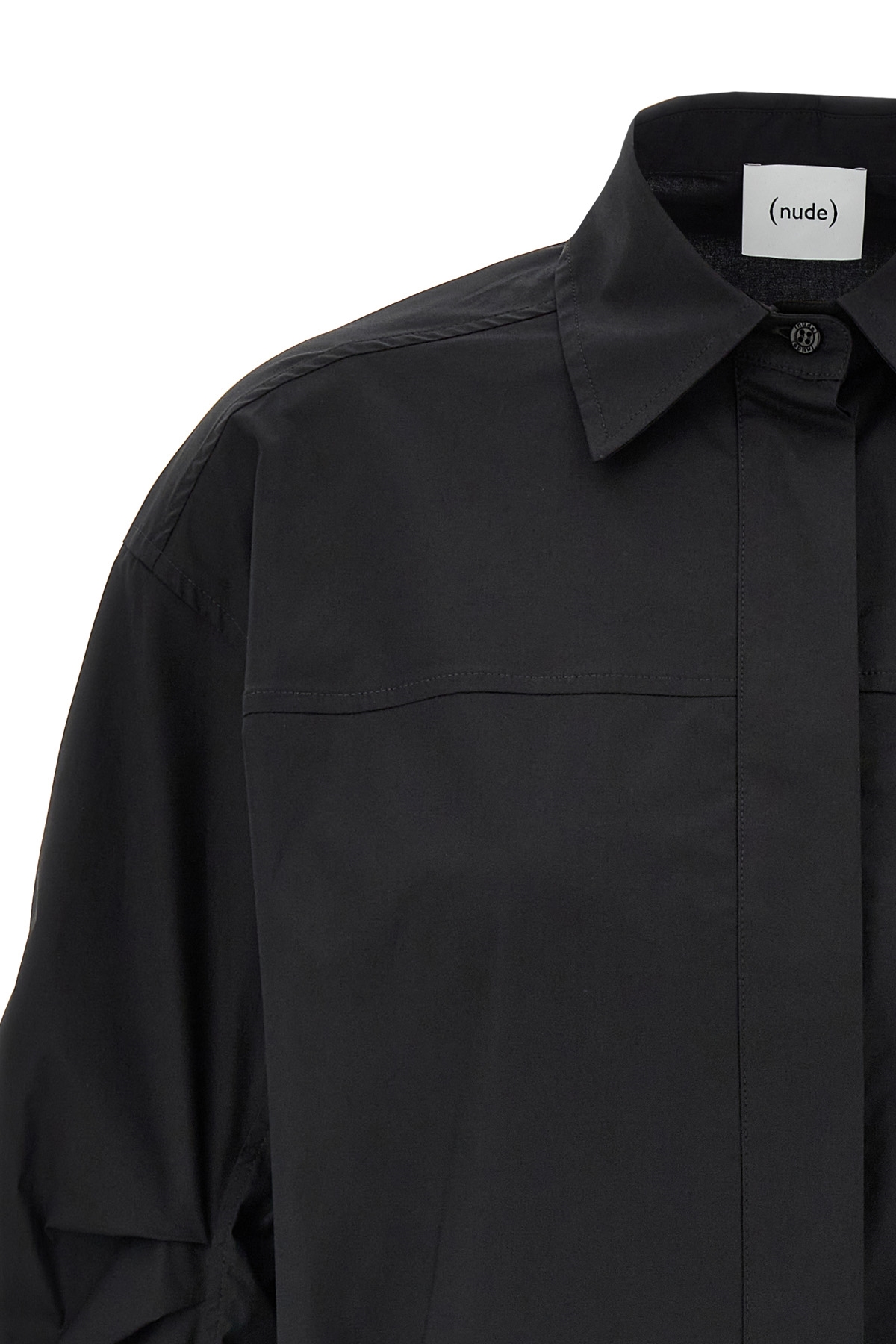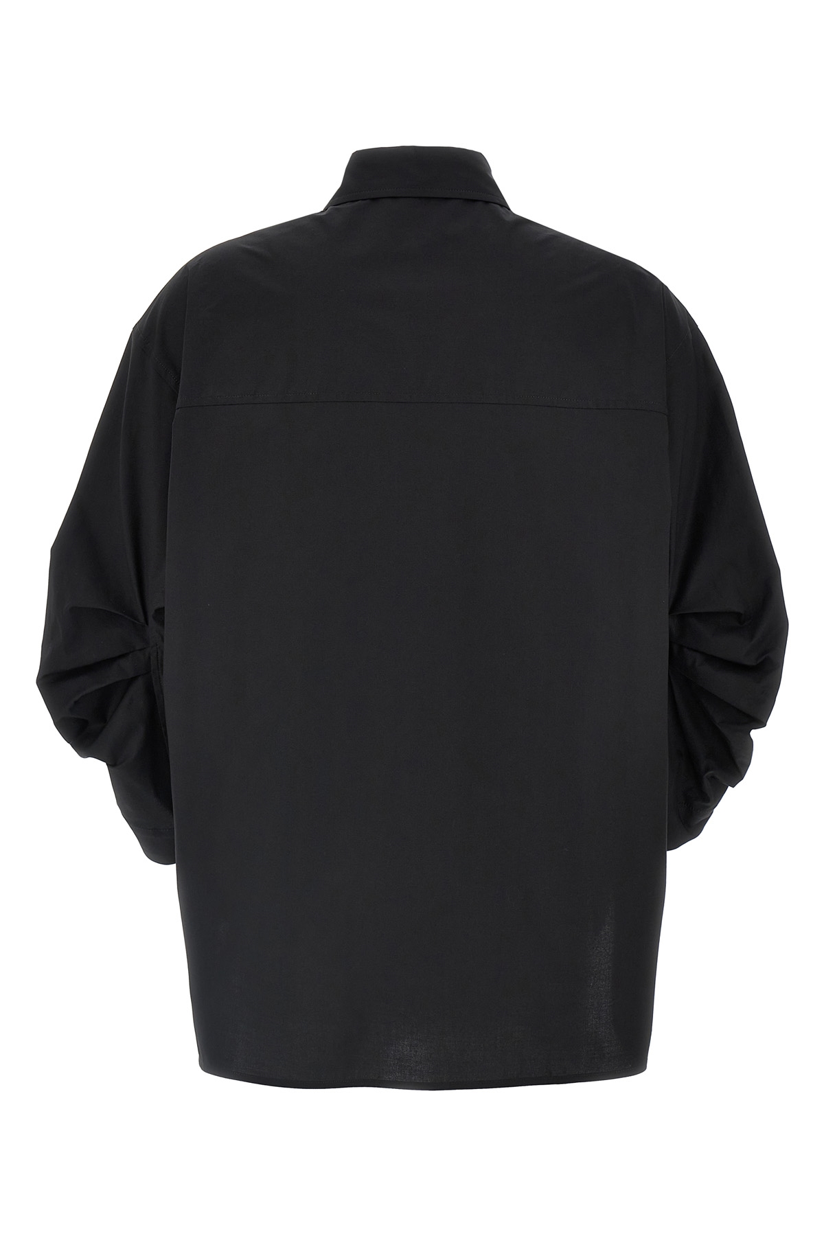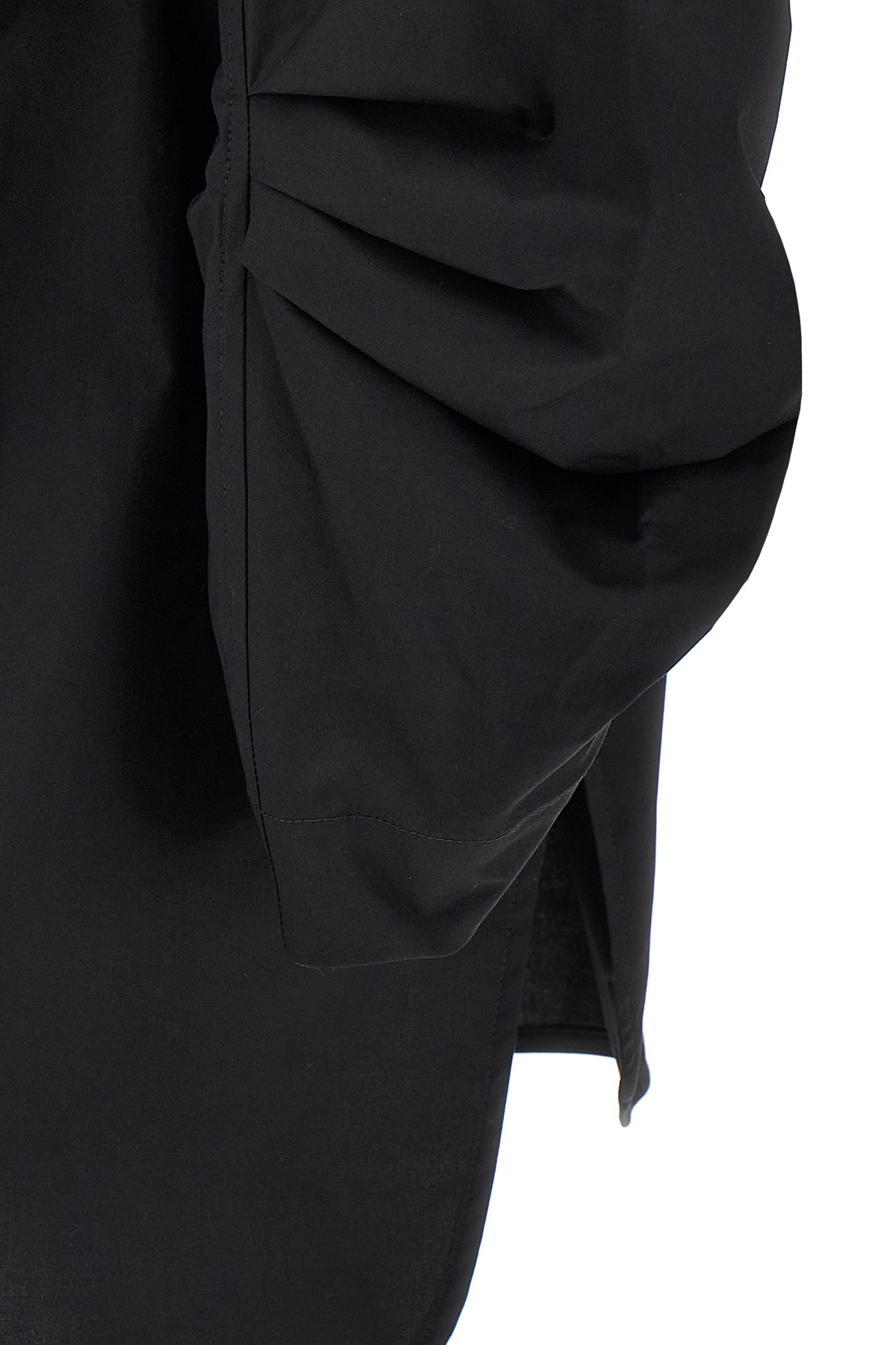 Stretch cotton poplin shirt with button closure, 3/4 crinkled sleeves, side slits.