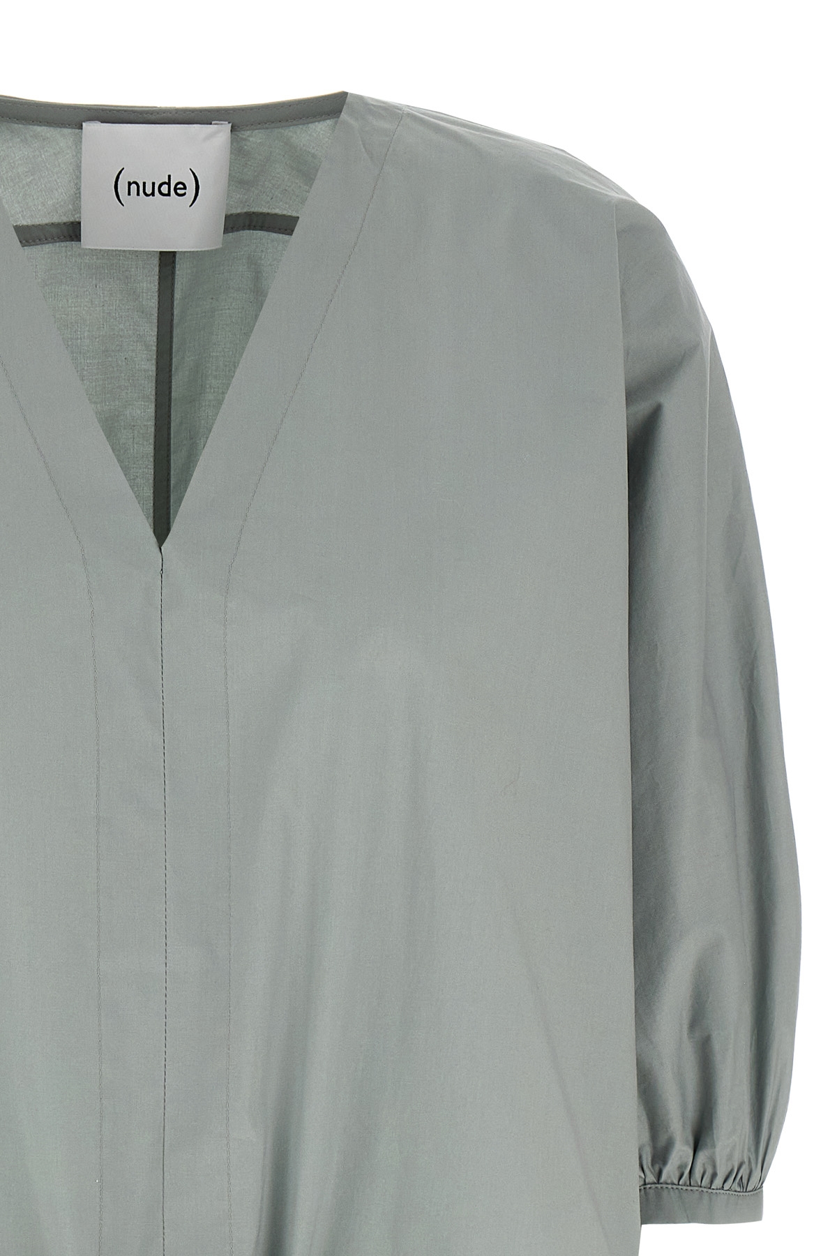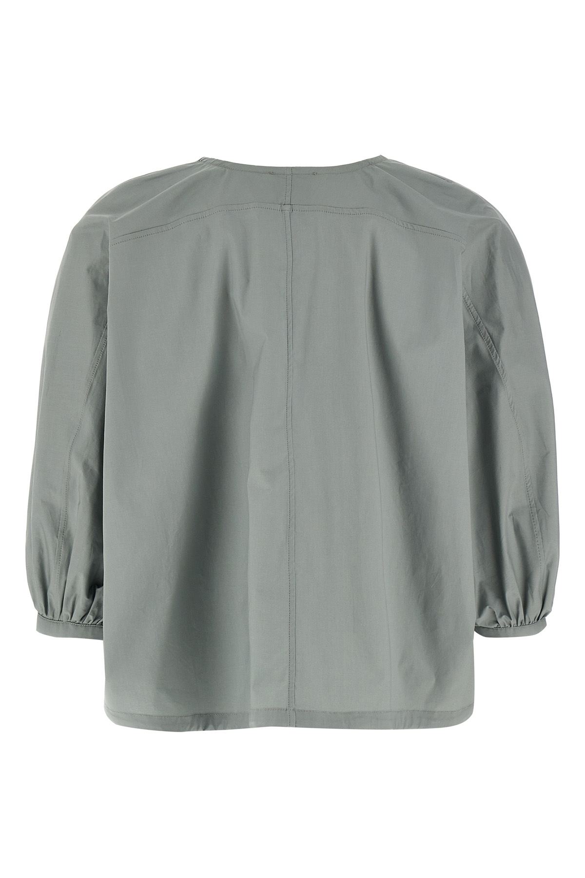 Cotton poplin blouse, V-neck, crop model with drawstring on the hem, 3/4 sleeves with cuffs and dropped shoulder.