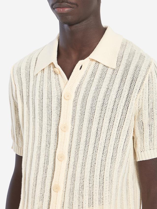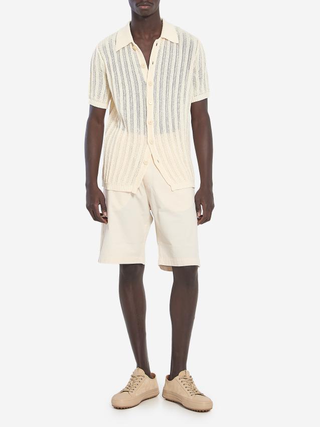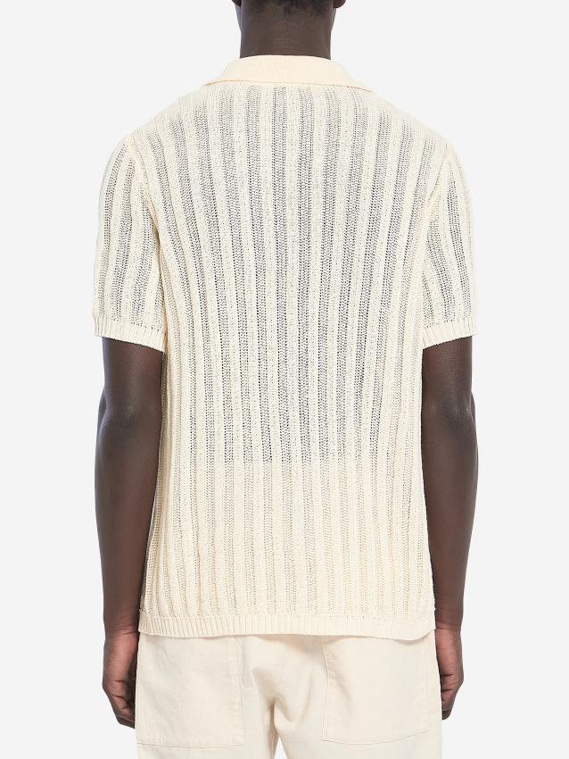 Elo Maris short-sleeve shirt in lightweight openwork knit cotton. It features a pointed collar, a front button closure, and ribbed collar and