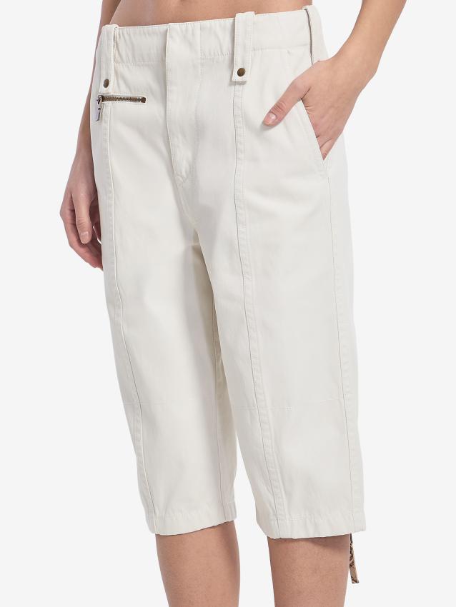 White cotton Capri pants. They feature a snap button and zip closure, belt loops, two side pockets, a small zip pocket on the front, a zip pocket at