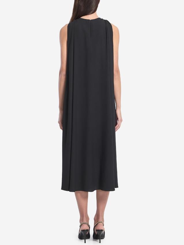 Sleeveless black midi evening dress in an acetate blend fabric. It features a halter neckline with a gold-toned metal bamboo necklace detail, a